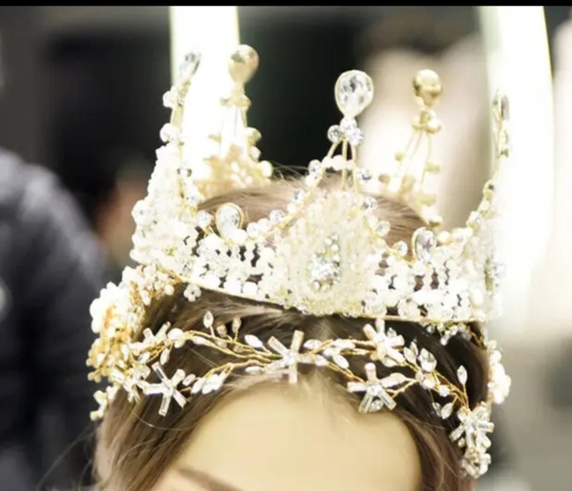万能小人掌柜的:冠冕主体呈优雅弧线,中央镶嵌一颗鹅卵石大的宝石,周围环绕着渐变排列的细碎钻石,营造出众星捧月般的…… 底部采用藤蔓花环造型,用精巧的金属丝勾勒出灵动的枝叶轮廓,其间点缀着小巧玲珑的花卉吊坠-……整件作品宛如从星空中摘下的璀璨银河,庄重典雅,又不失灵动飘逸……