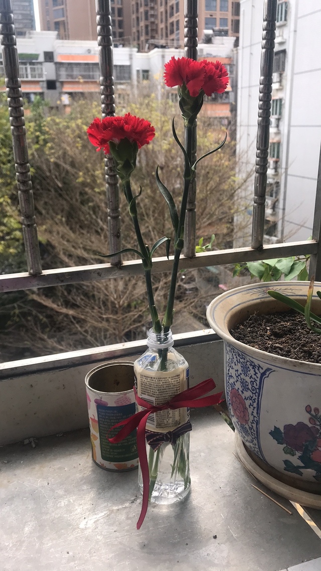 今天中午吃饭的时候,工作人员送了我和我妈一人一朵花,好开心