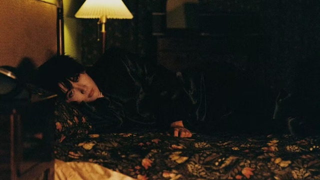 他侧卧在床上,身形挺拔,一只手自然搭在前方,眼眸深邃而迷人。