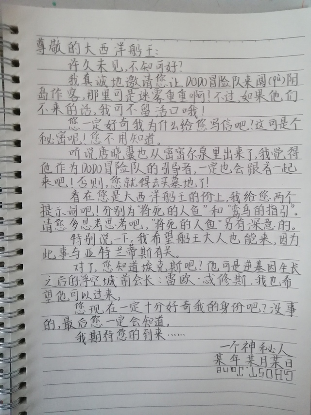 (这里是作者大大自己写的,最后一行是一道谜题,有关写信人和幕后黑手的身份,猜出来的旁边集合。我的字可能不好看,请见谅,因为我才六年级)