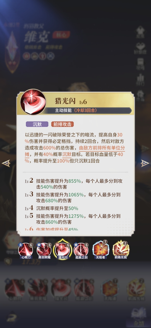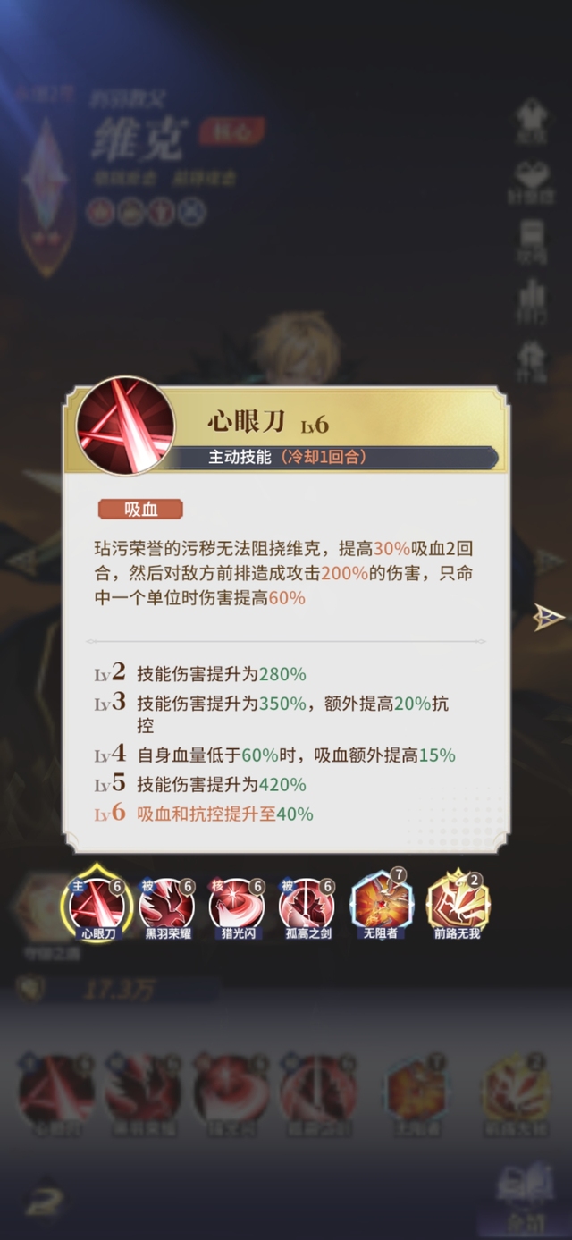 玷污荣誉的污秽无法阻挠维克,提高30%吸血2回合,然后对敌方前排造成攻击210%的伤害,只命中一个单位时伤害提高60%