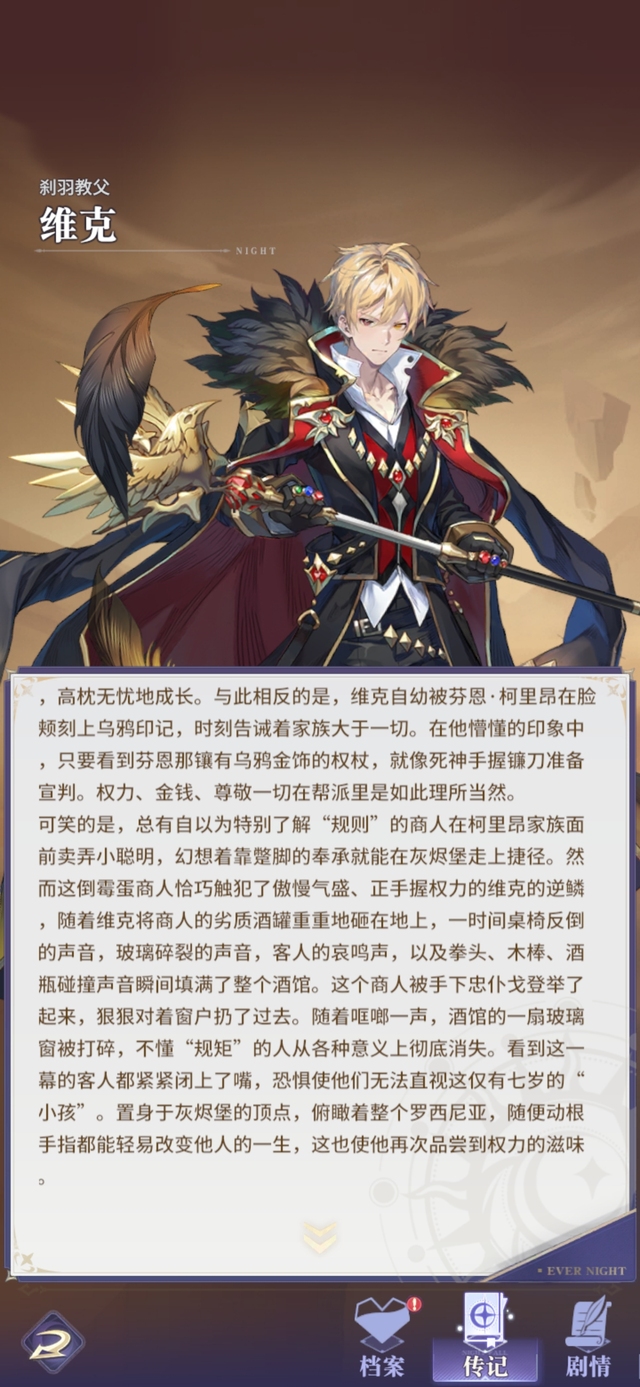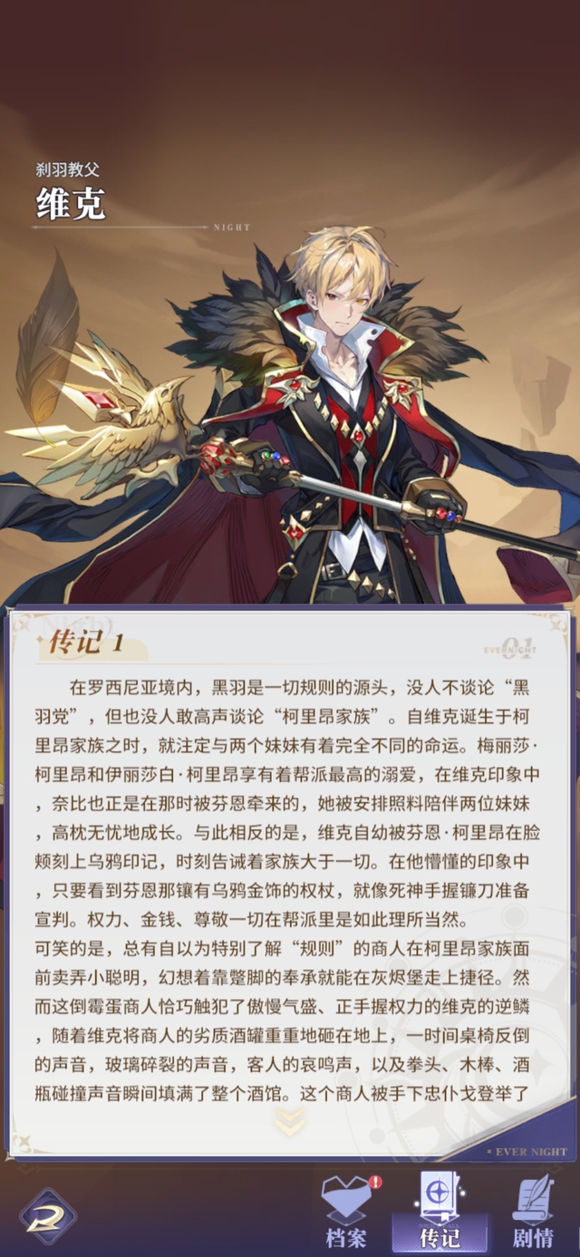 在罗西尼亚境内,黑羽是一切规则的源头,没人不谈论"黑羽党",但也没人敢高声谈论"柯里昂家族"。自维克诞生于柯里昂家族之时,就注定与两个妹妹有着完全不同的命运。梅丽莎·柯里昂和伊丽莎白·柯里昂享有着帮派最高的溺爱,在维克印象中,奈比也正是在那时被芬恩牵来的,她被安排照料陪伴两位妹妹,高枕无忧地成长。与此相反的是,维克自幼被芬恩·柯里昂在脸颊刻上乌鸦印记,时刻告诫着家族大于一切。在他懵懂的印象中,只要看到芬恩那镶有乌鸦金饰的权杖,就像死神手握镰刀准备宣判。权力、金钱、尊敬一切在帮派里是如此理所当然。可笑的是,总有自以为特别了解"规则"的商人在柯里昂家族面前卖弄小聪明,幻想着靠蹩脚的奉承就能在灰烬堡走上捷径。然而这倒霉蛋商人恰巧触犯了傲慢气盛、正手握权力的维克的逆鳞,随着维克将商人的劣质酒罐重重地砸在地上,一时间桌椅反倒的声音,玻璃碎裂的声音,客人的哀鸣声,以及拳头、木棒、酒瓶碰撞声音瞬间填满了整个酒馆。这个商人被手下忠仆戈登举了起来,狠狠对着窗户扔了过去。随着哐啷一声,酒馆的一扇玻璃窗被打碎,不懂"规矩"的人从各种意义上彻底消失。看到这一幕的客人都紧紧闭上了嘴,恐惧使他们无法直视这仅有七岁的"小孩"。置身于灰烬堡的顶点,俯瞰着整个罗西尼亚,随便动根手指都能轻易改变他人的一生,这也使他再次品尝到权力的滋味。