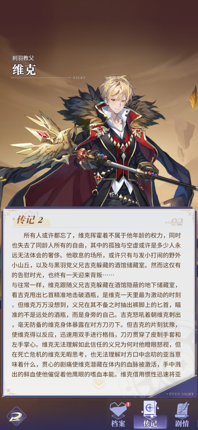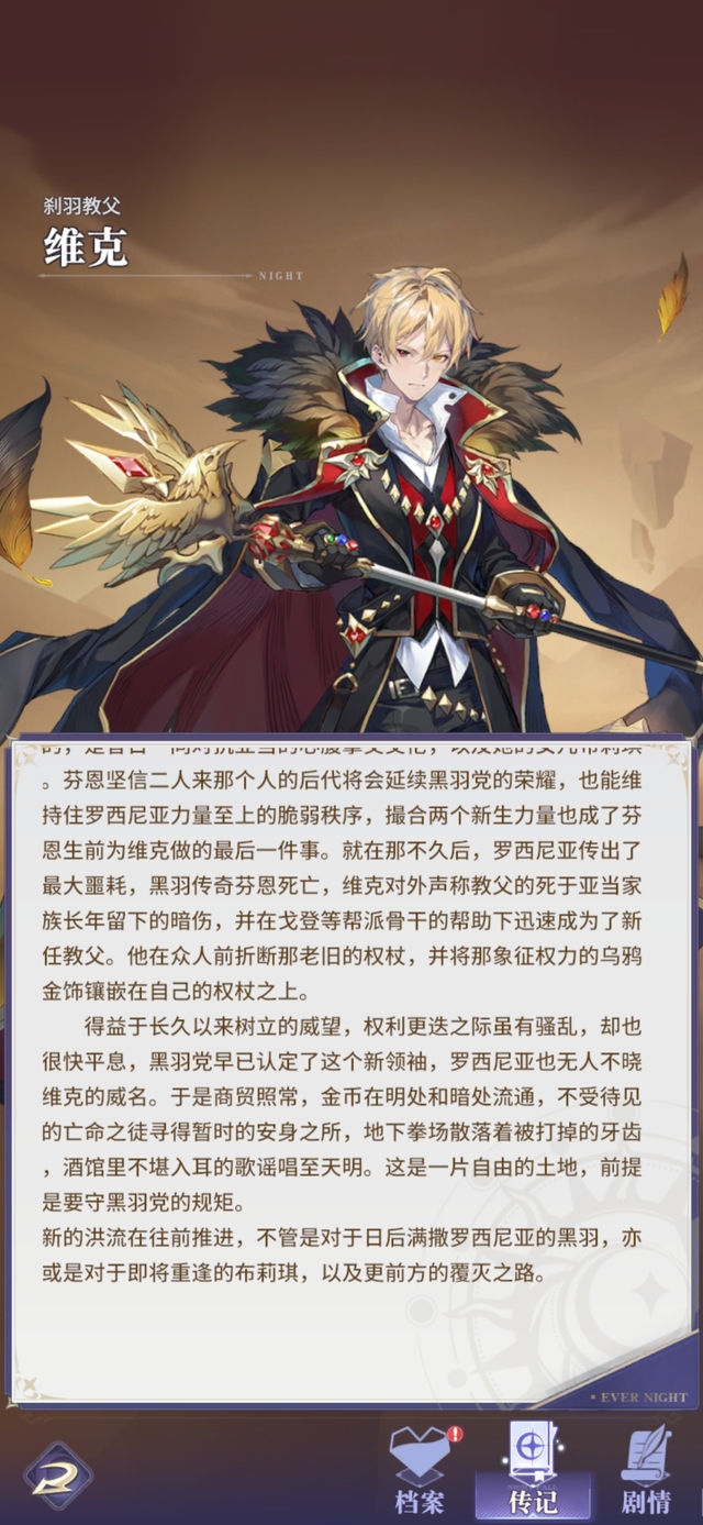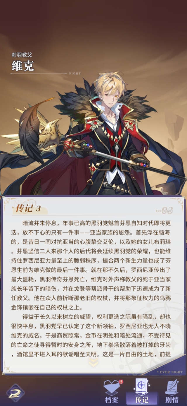 暗流并未停息,年事已高的黑羽党魁首芬恩自知时代即将更迭,放不下心的只有一件事﹣﹣亚当家族的恩怨。首先浮在脑海的,是昔日一同对抗亚当的心腹挚交艾伦,以及她的女儿布莉琪。芬恩坚信二人来那个人的后代将会延续黑羽党的荣耀,也能维持住罗西尼亚力量至上的脆弱秩序,撮合两个新生力量也成了芬恩生前为维克做的最后一件事。就在那不久后,罗西尼亚传出了最大噩耗,黑羽传奇芬恩死亡,维克对外声称教父的死于亚当家族长年留下的暗伤,并在戈登等帮派骨干的帮助下迅速成为了新任教父。他在众人前折断那老旧的权杖,并将那象征权力的乌鸦金饰镶嵌在自己的权杖之上。