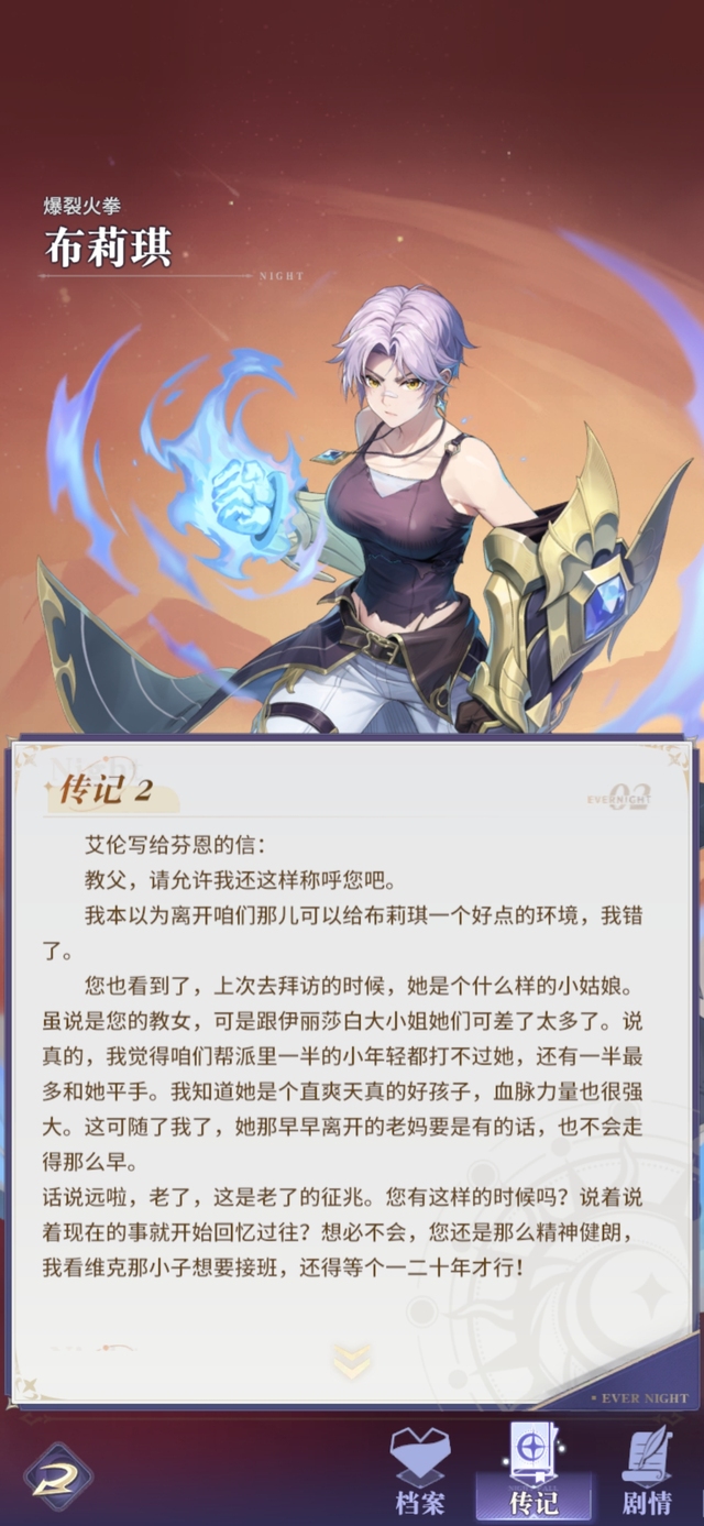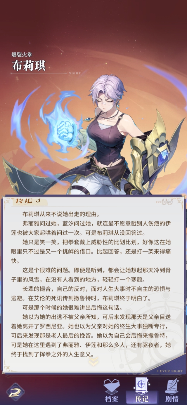 她以为她的出逃不被父亲所知,可后来发现那天是父亲目送着她离开了罗西尼亚。她也以为父亲对她的终生大事独断专行,可后来发现那是老人最后的挽留。她以为自己会后悔来撒鲁特,可是她在这里遇到了弗丽雅、伊莲和那么多人,还有驱夜者,她终于找到了挥拳之外的人生意义。