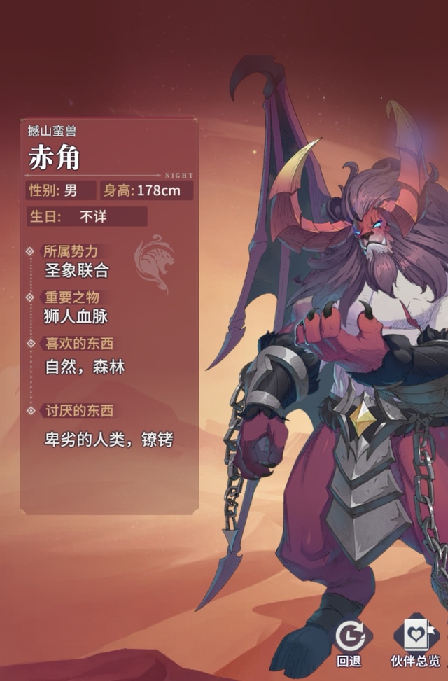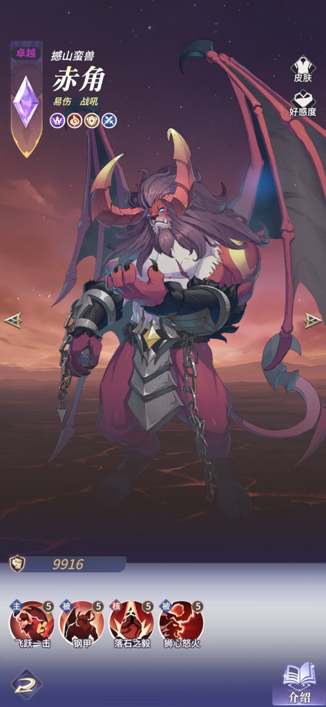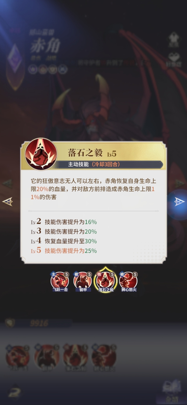 它的狂傲意志无人可以左右,赤角恢复自身生命上限20%的血量,并对敌方前排造成赤角生命上限11%的伤害。