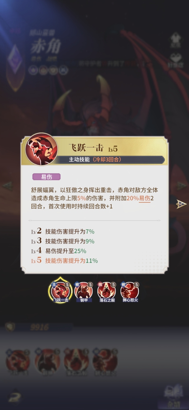 舒展蝠翼,以狂傲之身挥出重击,赤角对敌方全体造成赤角生命上限5%的伤害,并附加20%易伤2回合,首次使用时持续回合数+1