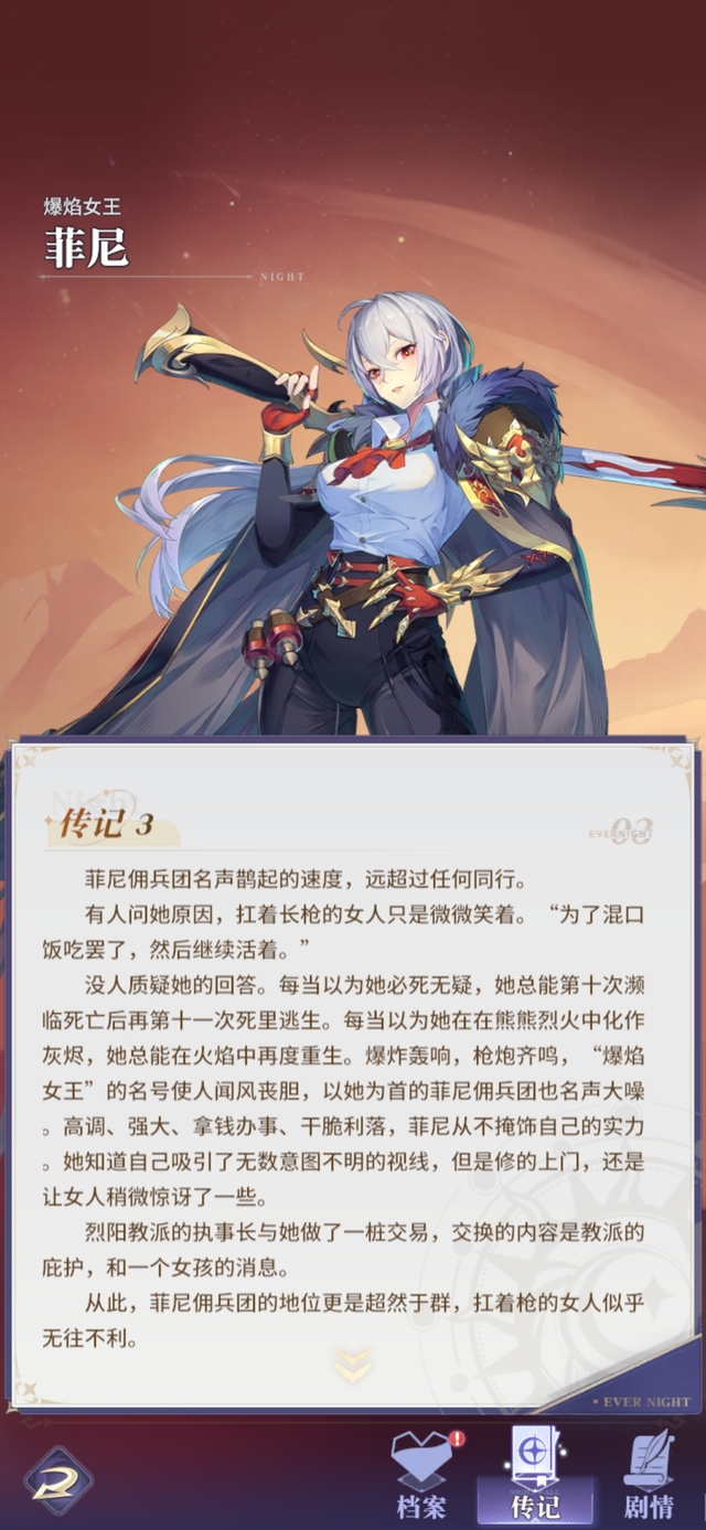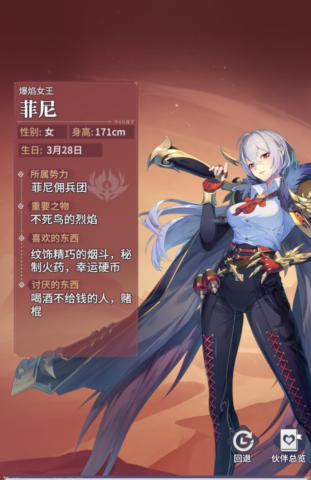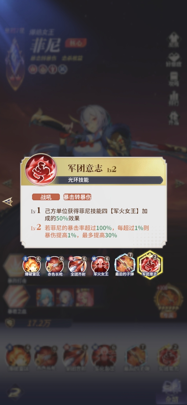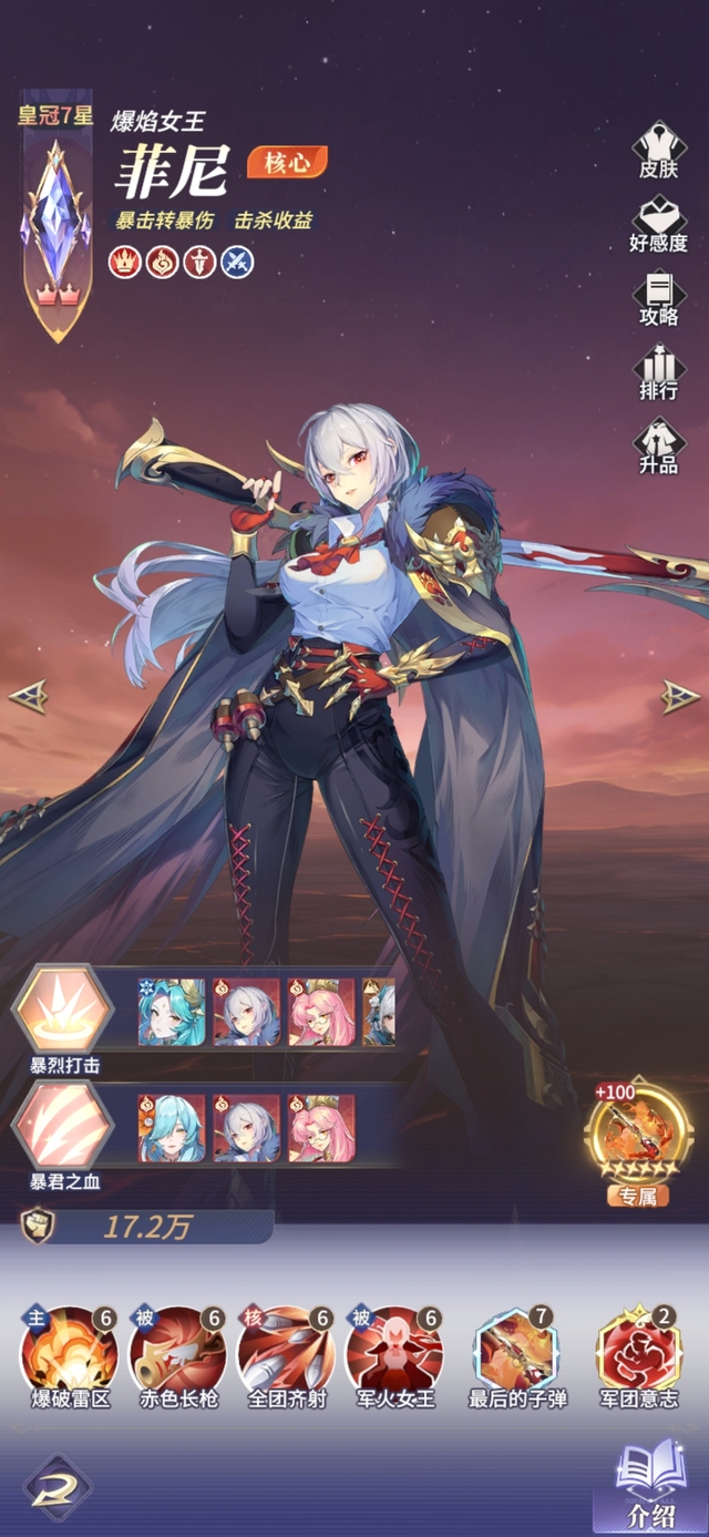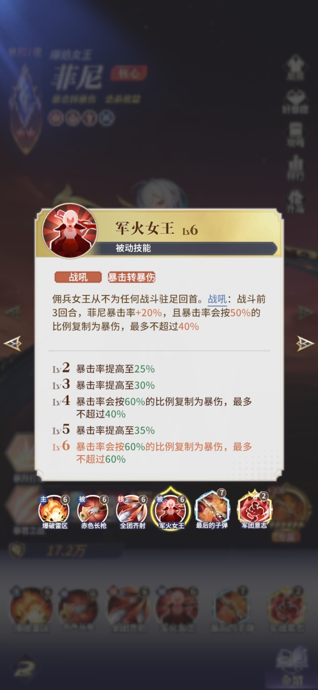 佣兵女王从不为任何战斗驻足回首。战吼:战斗前3回合,菲尼暴击率+20%,且暴击率会按50%的比例复制为暴伤,最多不超过40%