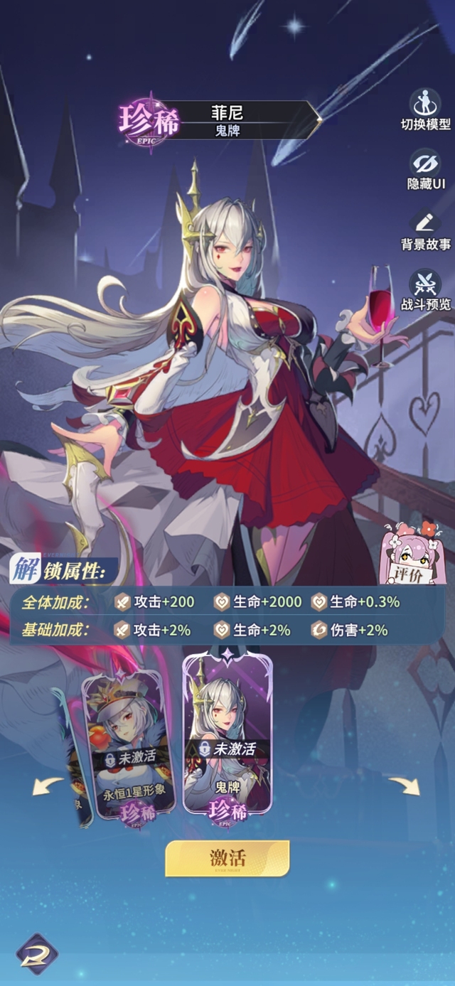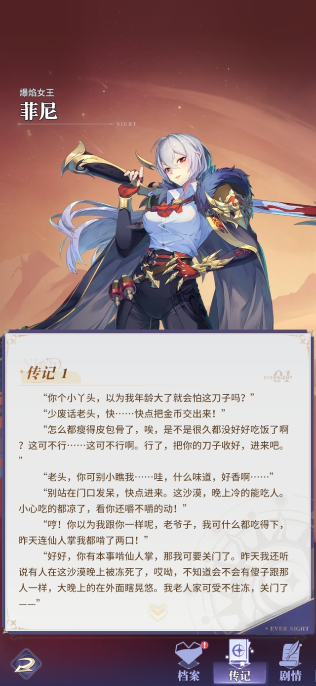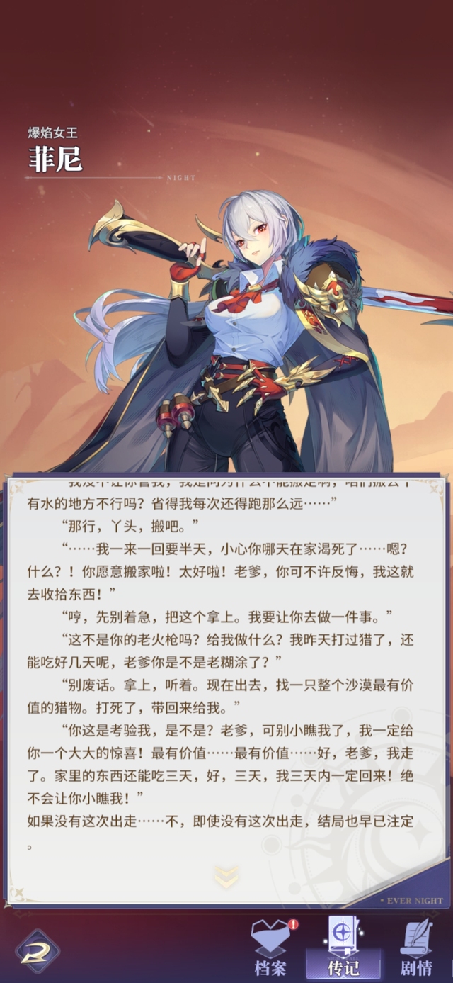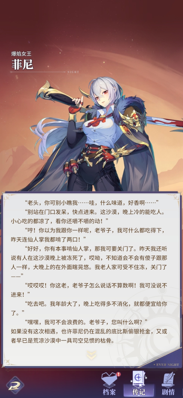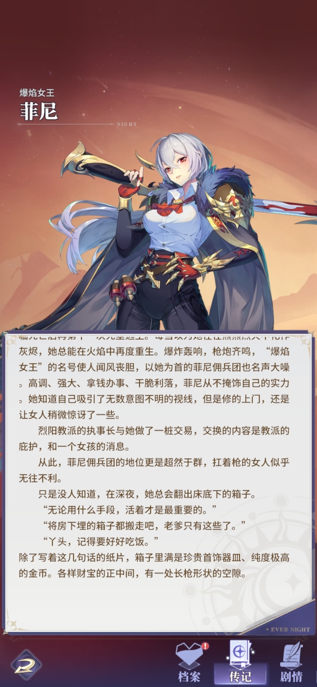 佣兵女王从不为任何战斗驻足回首。战吼:战斗前3回合,菲尼暴击率+20%,且暴击率会按50%的比例复制为暴伤,最多不超过40%