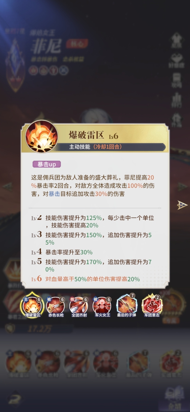 这是佣兵团为敌人准备的盛大葬礼,菲尼提高20%暴击率2回合,对敌方全体造成攻击100%的伤害,对暴击目标追加攻击30%的伤害。