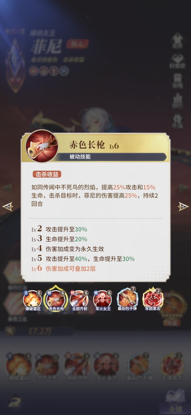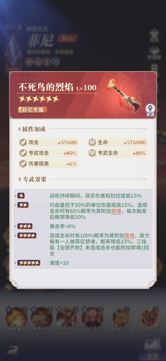 如同传闻中不死鸟的烈焰,提高25%攻击和15%生命,击杀目标时,菲尼的伤害提高25%,持续2回合。