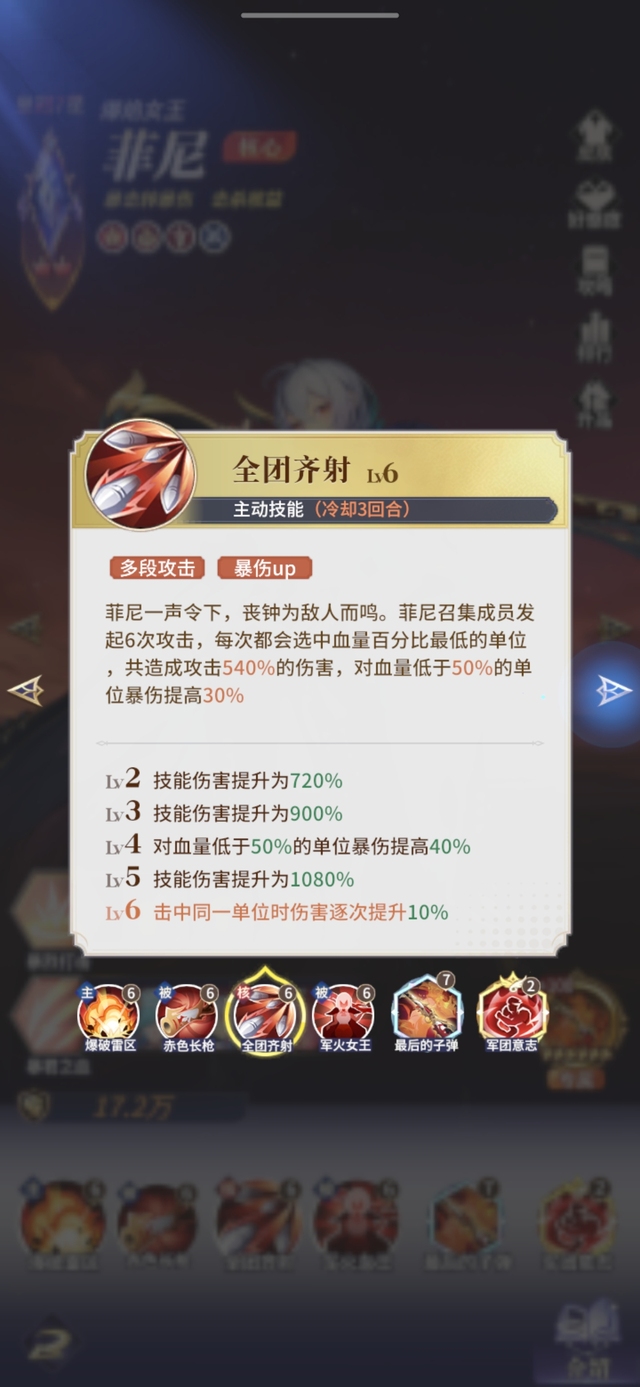 菲尼一声令下,丧钟为敌人而鸣。菲尼召集成员发起6次攻击,每次都会选中血量百分比最低的单位,共造成攻击540%的伤害,对血量低于50%的单位暴伤提高30%