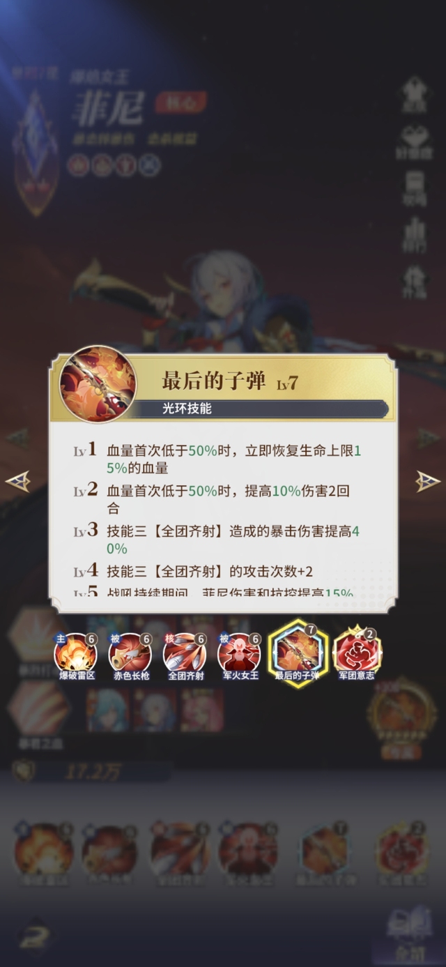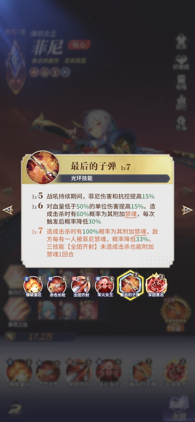 Lv7 造成击杀时有100%概率为其附加禁魂,敌方每有一人被菲尼禁魂,概率降低33%。三技能【全团齐射】未造成击杀也能附加禁魂1回合。