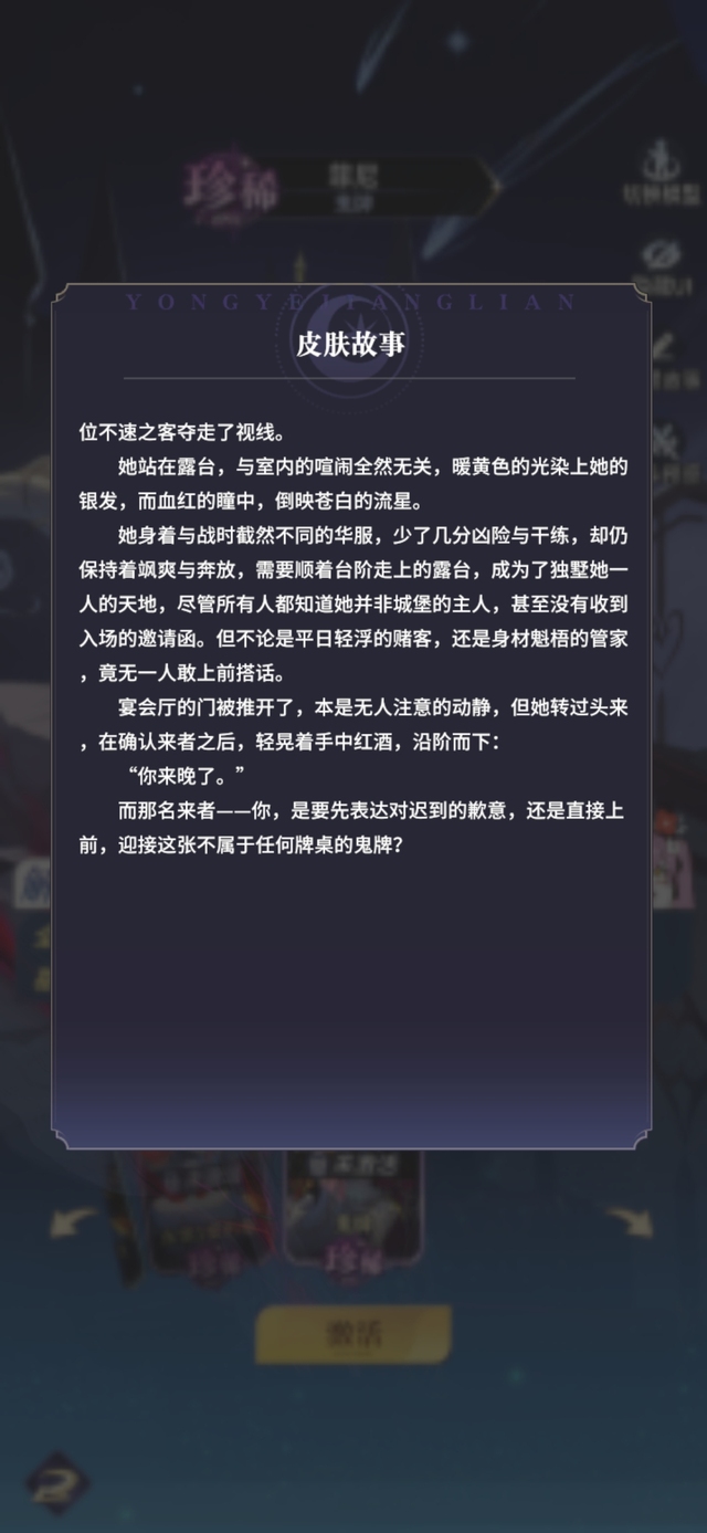 她身着与战时截然不同的华服,少了几分凶险与干练,却仍保持着飒爽与奔放,需要顺着台阶走上的露台,成为了独墅她一人的天地,尽管所有人都知道她并非城堡的主人,甚至没有收到入场的邀请函。但不论是平日轻浮的赌客,还是身材魁梧的管家,竟无一人敢上前搭话。