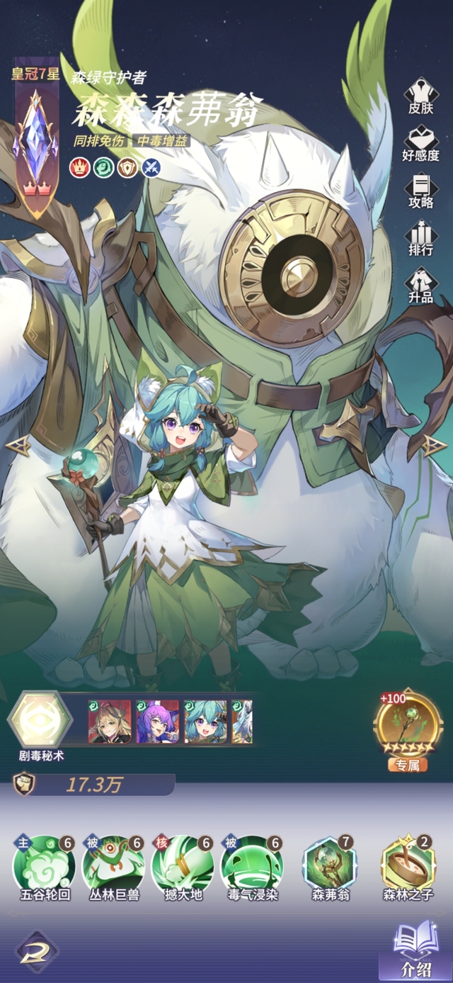 毒气领域,护森女,蚀锐器,森森受到攻击时有30%概率为攻击者附加中毒。每回合结束时,森森为同排队友恢复血量,恢复量等同森森生命上限的6%
