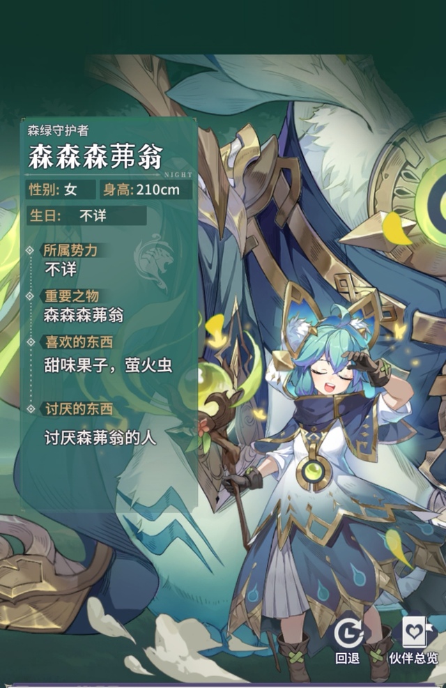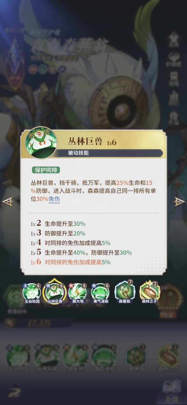 丛林巨兽,挡千骑,抵万军,提高25%生命和15%防御,进入战斗时,森森提高自己同一排所有单位30%免伤。