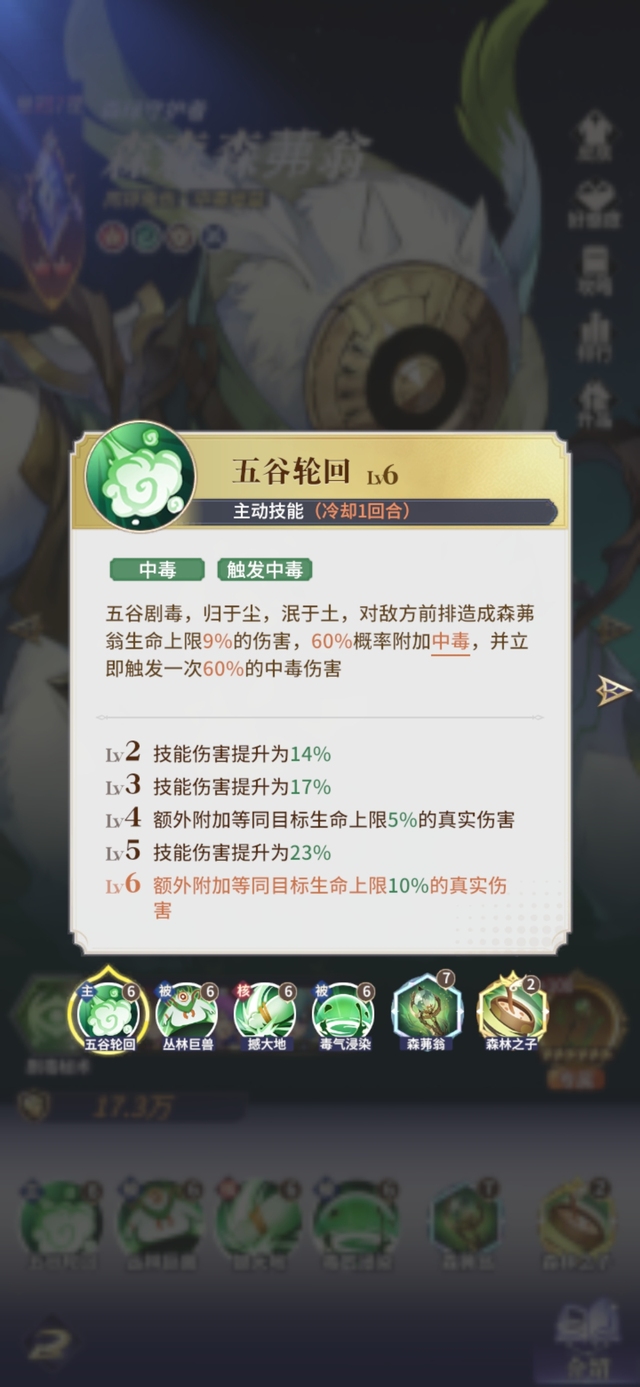五谷剧毒,归于尘,泯于土,对敌方前排造成森翁生命上限9%的伤害,60%概率附加中毒,并立即触发一次60%的中毒伤害。