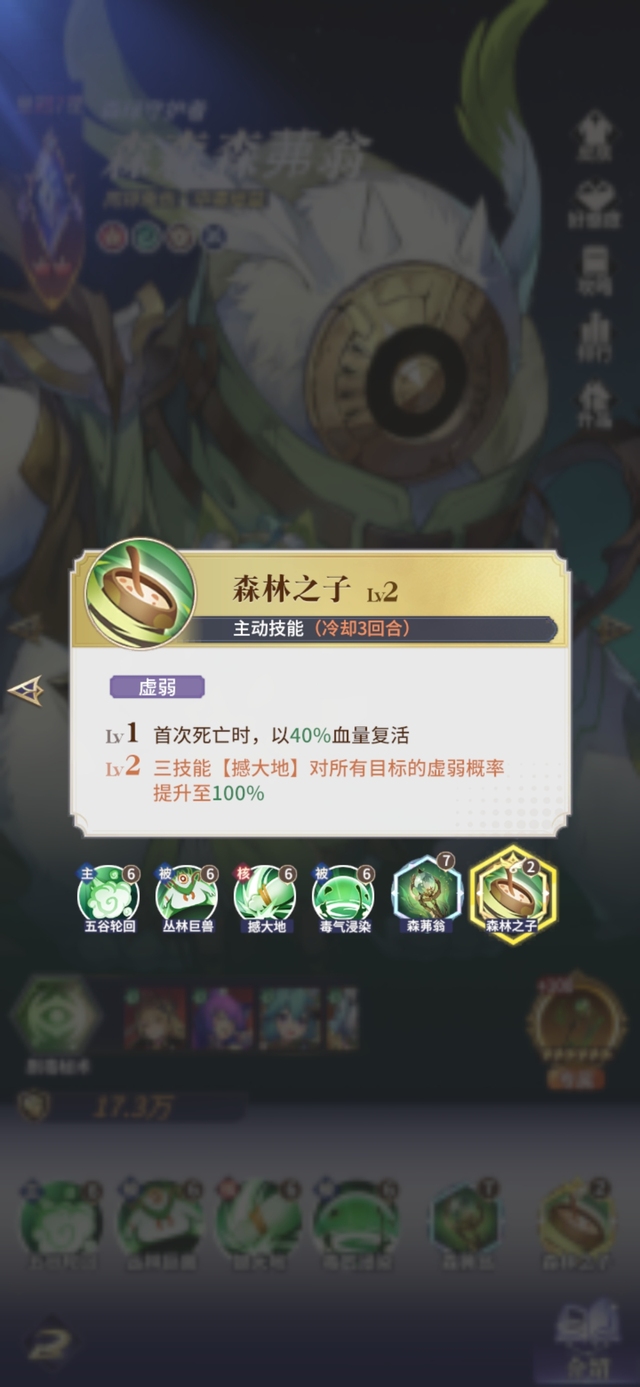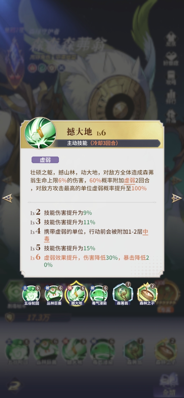 壮硕之躯,撼山林,动大地,对敌方全体造成森茀翁生命上限6%的伤害,60%概率附加虚弱2回合,对敌方攻击最高的单位虚弱概率提升至100%