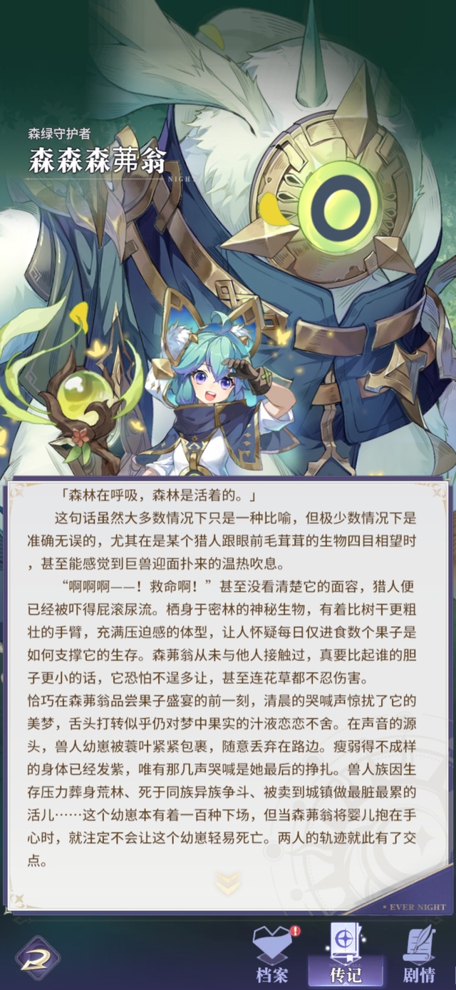"啊啊啊﹣-!救命啊!"甚至没看清楚它的面容,猎人便已经被吓得屁滚尿流。栖身于密林的神秘生物,有着比树干更粗壮的手臂,充满压迫感的体型,让人怀疑每日仅进食数个果子是如何支撑它的生存。森茀翁从未与他人接触过,真要比起谁的胆子更小的话,它恐怕不逞多让,甚至连花草都不忍伤害。恰巧在森茀翁品尝果子盛宴的前一刻,清晨的哭喊声惊扰了它的美梦,舌头打转似乎仍对梦中果实的汁液恋恋不舍。在声音的源头,兽人幼崽被蓑叶紧紧包裹,随意丢弃在路边。瘦弱得不成样的身体已经发紫,唯有那几声哭喊是她最后的挣扎。兽人族因生存压力葬身荒林、死于同族异族争斗、被卖到城镇做最脏最累的活儿……这个幼崽本有着一百种下场,但当森茀翁将婴儿抱在手心时,就注定不会让这个幼崽轻易死亡。两人的轨迹就此有了交点。