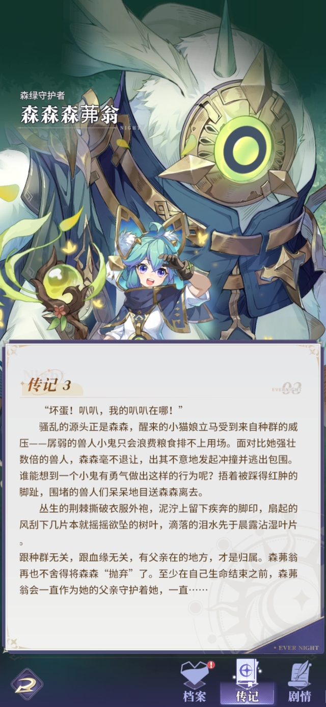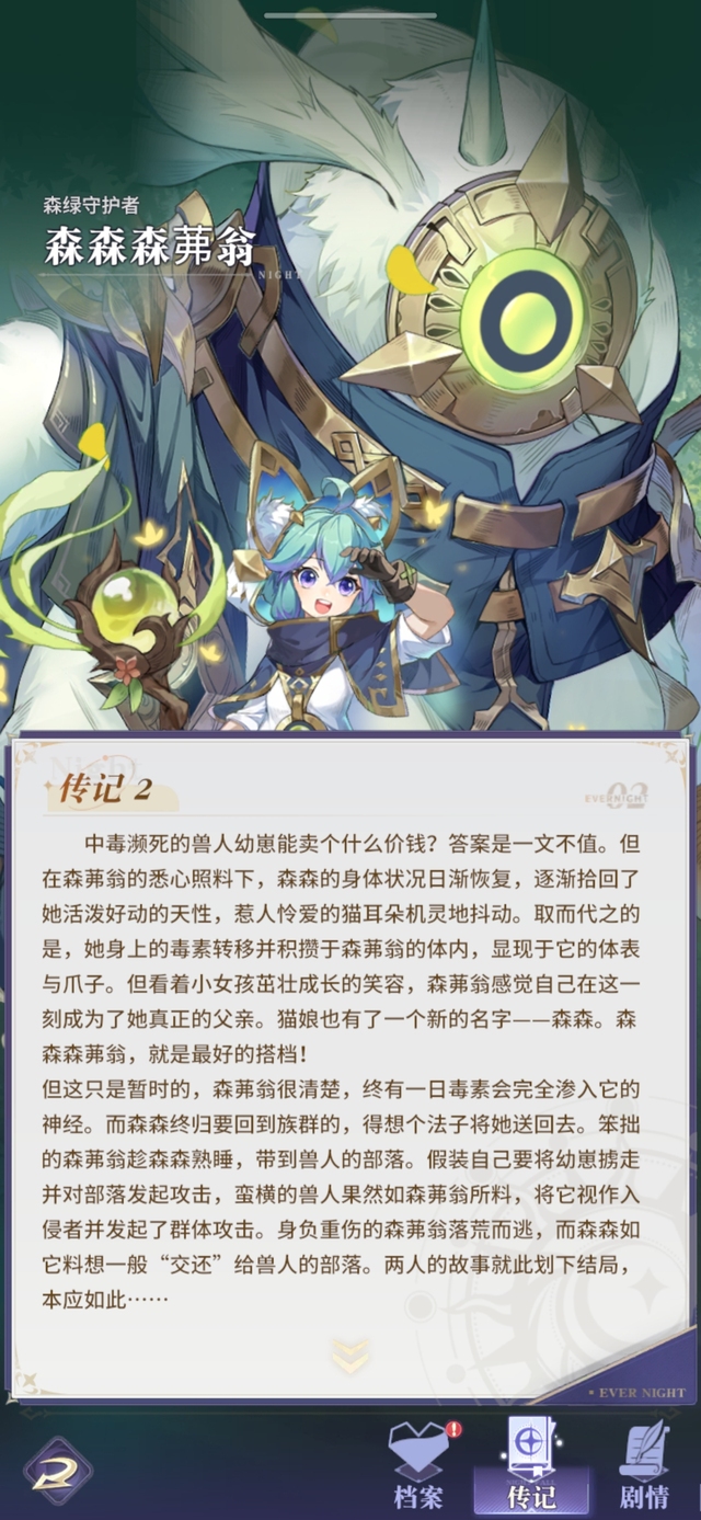 中毒濒死的兽人幼崽能卖个什么价钱?答案是一文不值。但在森茀翁的悉心照料下,森森的身体状况日渐恢复,逐渐拾回了她活泼好动的天性,惹人怜爱的猫耳朵机灵地抖动。取而代之的是,她身上的毒素转移并积攒于森茀翁的体内,显现于它的体表与爪子。但看着小女孩茁壮成长的笑容,森茀翁感觉自己在这一刻成为了她真正的父亲。猫娘也有了一个新的名字﹣﹣森森。森森森茀翁,就是最好的搭档!