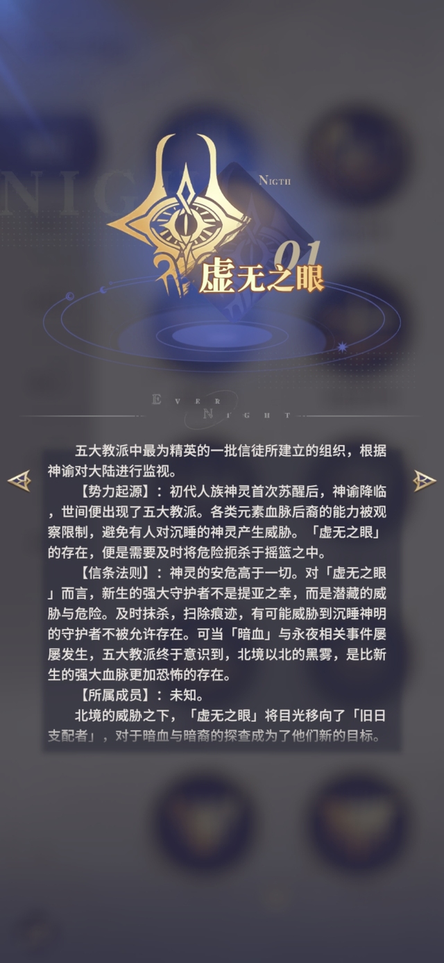 【势力起源】: 初代人族神灵首次苏醒后,神谕降临,世间便出现了五大教派。各类元素血脉后裔的能力被观察限制,避免有人对沉睡的神灵产生威胁。「虚无之眼」的存在,便是需要及时将危险扼杀于摇篮之中。