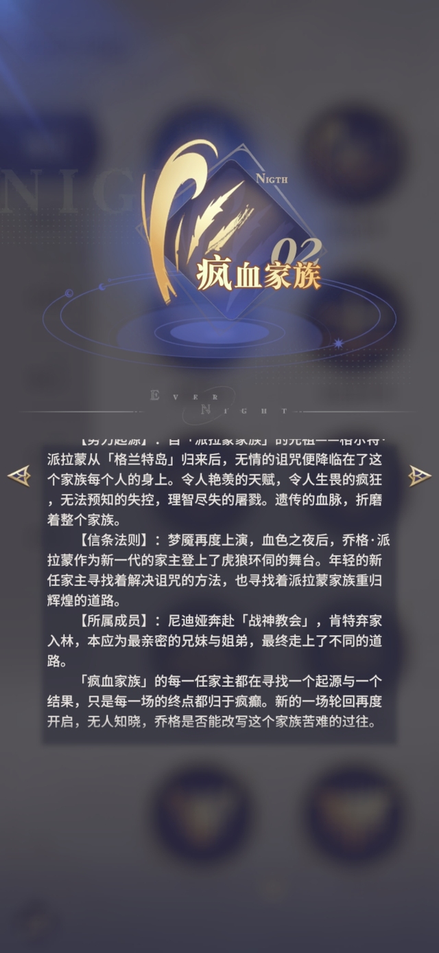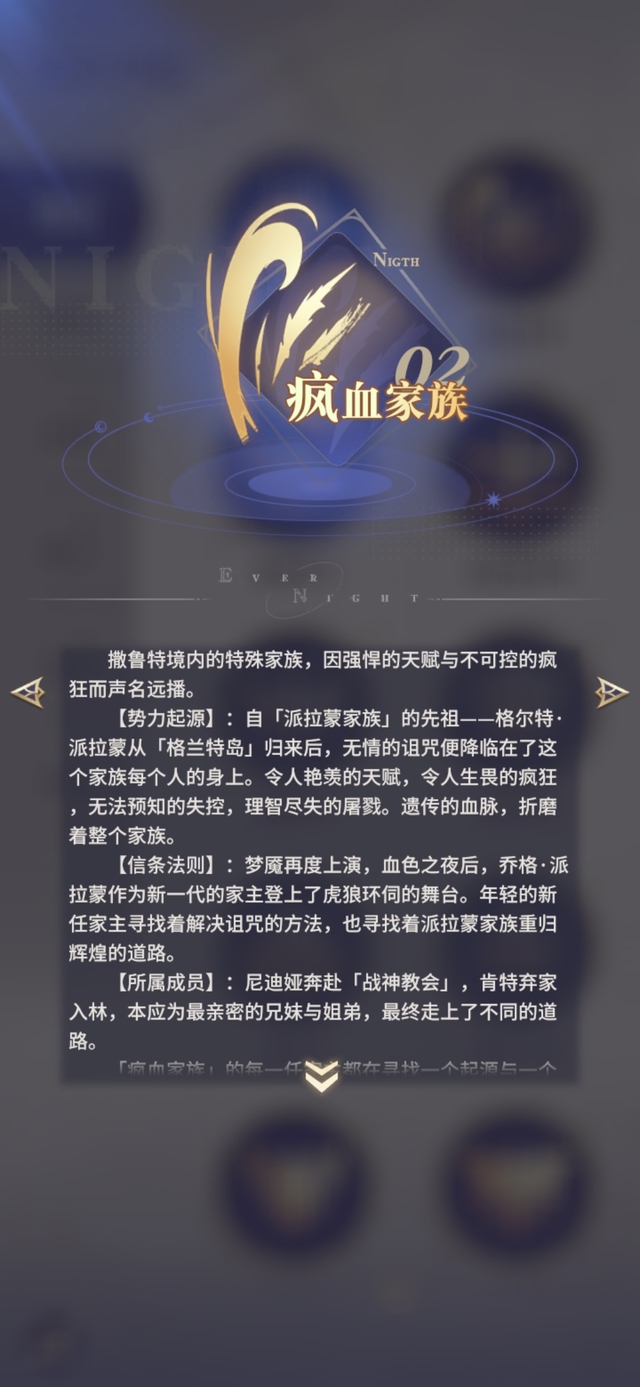 【势力起源】:自「派拉蒙家族」的先祖﹣﹣格尔特·派拉蒙从「格兰特岛」归来后,无情的诅咒便降临在了这个家族每个人的身上。令人艳羡的天赋,令人生畏的疯狂,无法预知的失控,理智尽失的屠戮。遗传的血脉,折磨着整个家族。