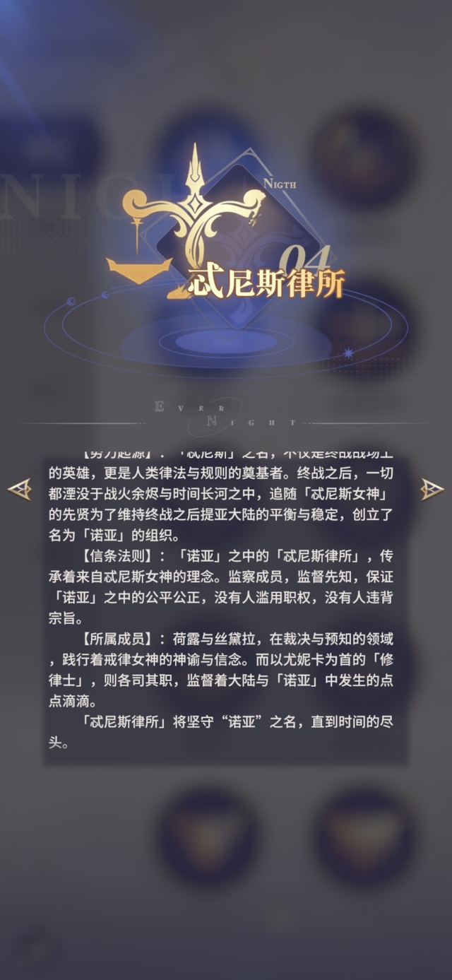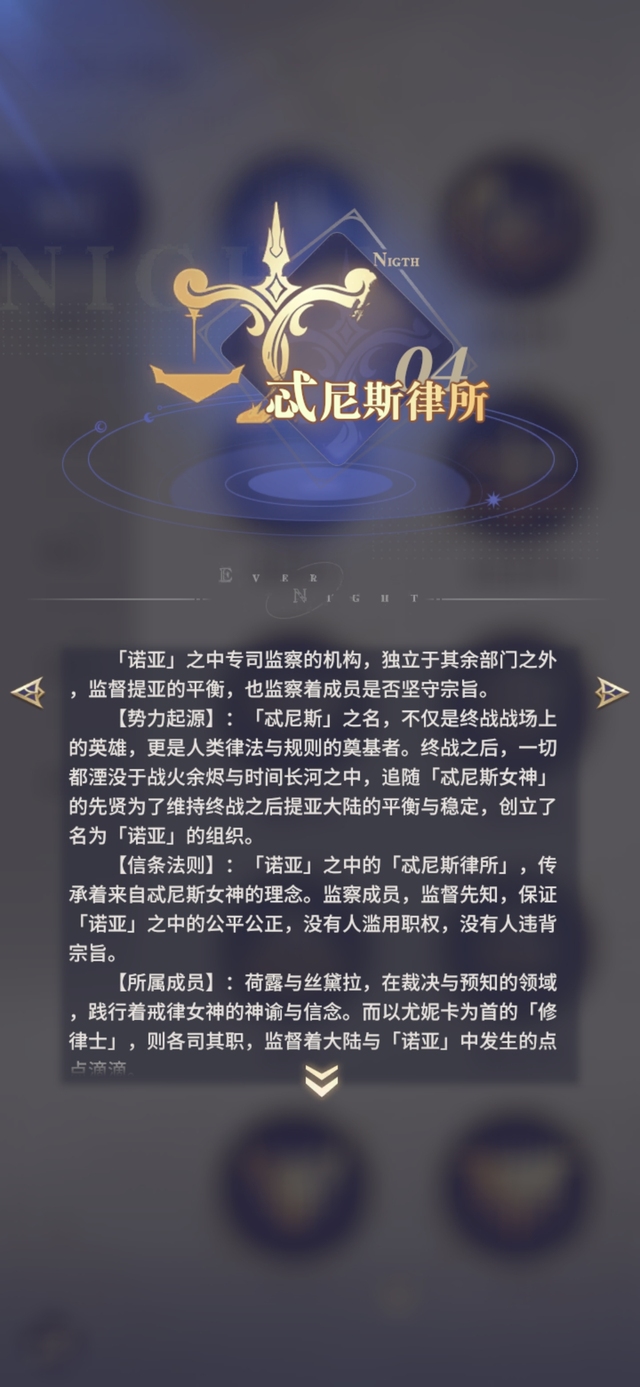 【信条法则】:「诺亚」之中战力巅峰的存在,聚集着整个「诺亚」在战斗方面最有才能的守护者。他们处理背叛,调停危机,在诸多与永夜相关的事件中都有他们的身影。一方面在「忒尼斯律所」的引导下执行裁决的记过,另一方面则在关键时刻支援各方的任务行动。