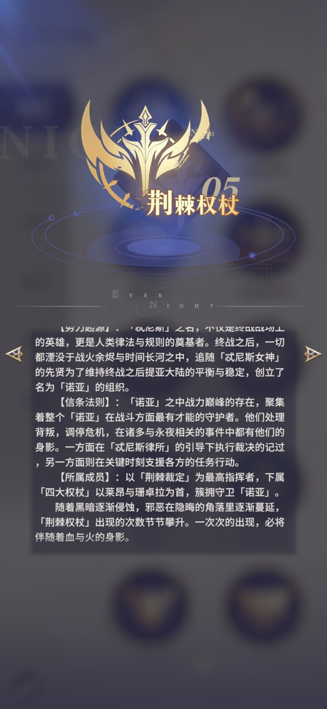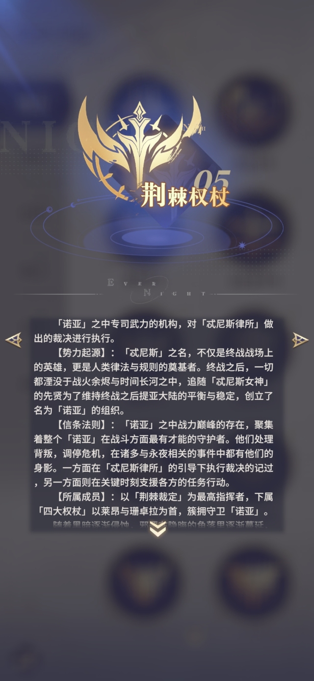 【所属成员】:以「荆棘裁定」为最高指挥者,下属「四大权杖」以莱昂与珊卓拉为首,簇拥守卫「诺亚」。
