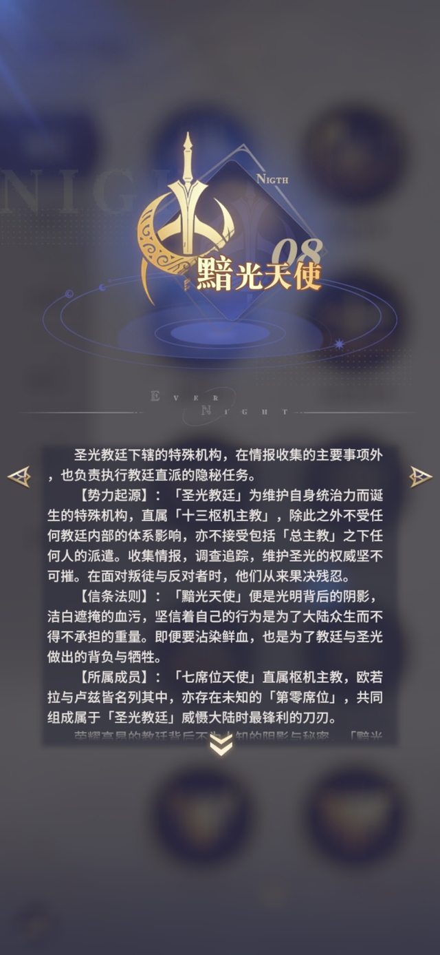 【所属成员】:「七席位天使」直属枢机主教,欧若拉与卢兹皆名列其中,亦存在未知的「第零席位」,共同组成属于「圣光教廷」威慑大陆时最锋利的刀刃。