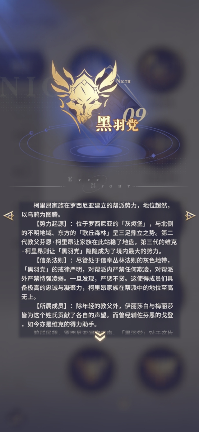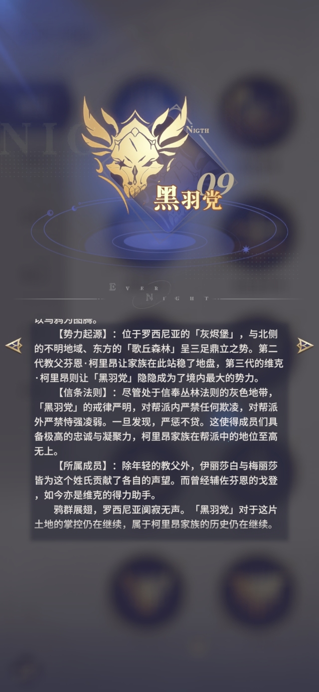 【势力起源】:位于罗西尼亚的「灰烬堡」,与北侧的不明地域、东方的「歌丘森林」呈三足鼎立之势。第二代教父芬恩·柯里昂让家族在此站稳了地盘,第三代的维克·柯里昂则让「黑羽党」隐隐成为了境内最大的势力。