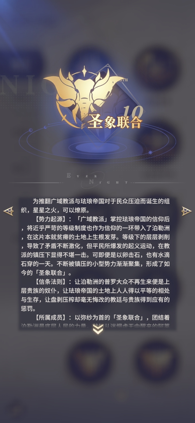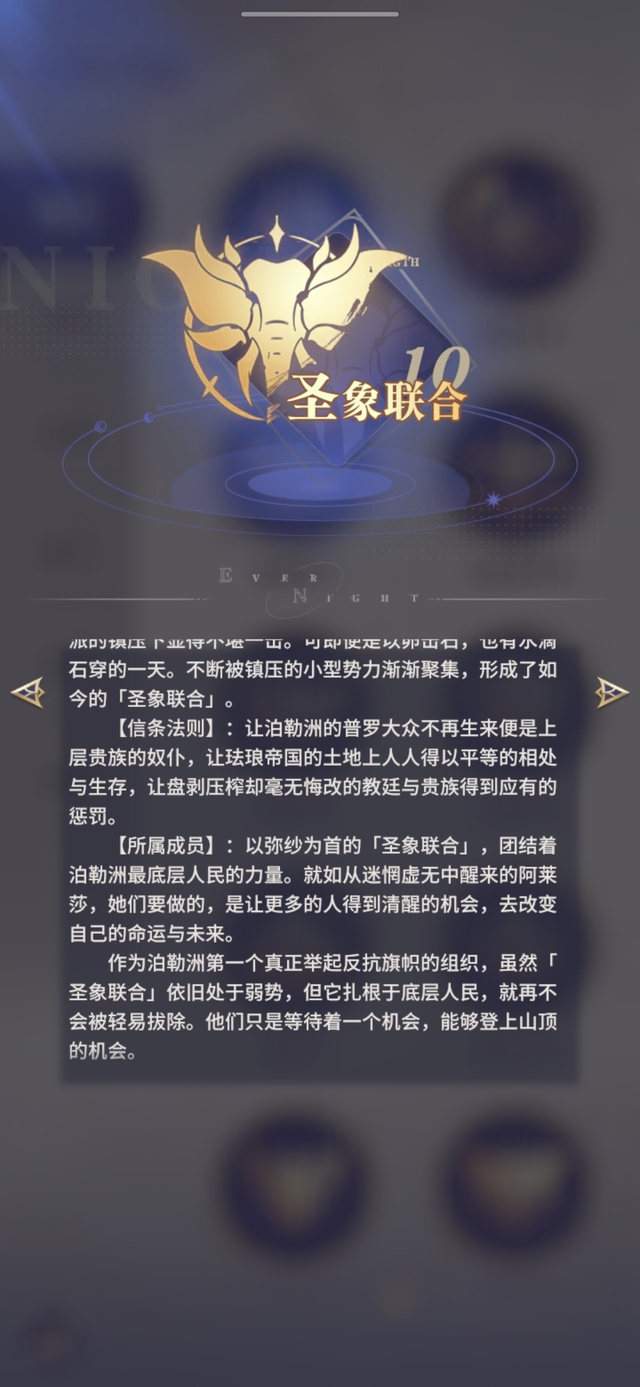 【所属成员】:以弥纱为首的「圣象联合」,团结着泊勒洲最底层人民的力量。就如从迷惘虚无中醒来的阿莱莎,她们要做的,是让更多的人得到清醒的机会,去改变自己的命运与未来。