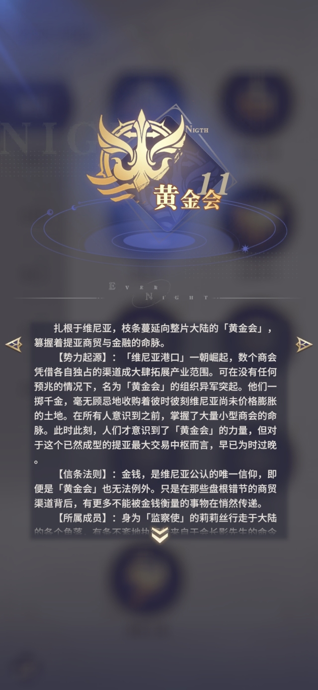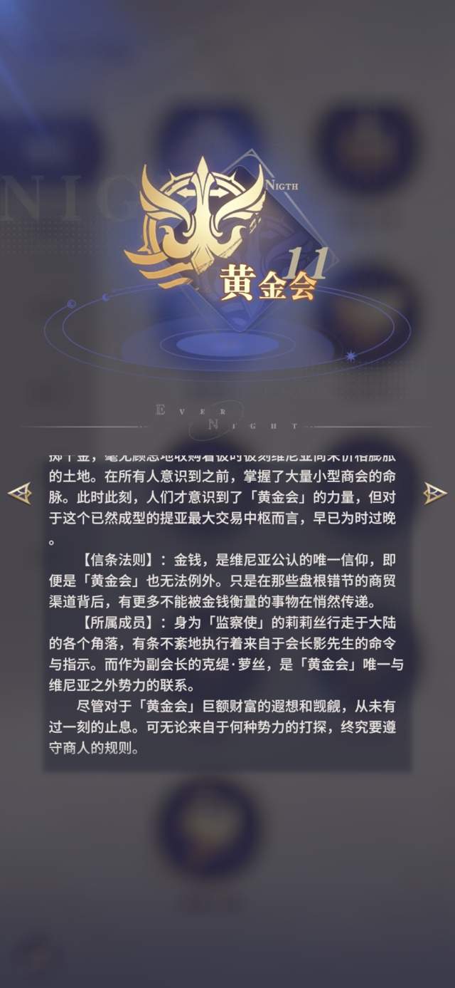 O 【信条法则】:金钱,是维尼亚公认的唯一信仰,即便是「黄金会」也无法例外。只是在那些盘根错节的商贸渠道背后,有更多不能被金钱衡量的事物在悄然传递。