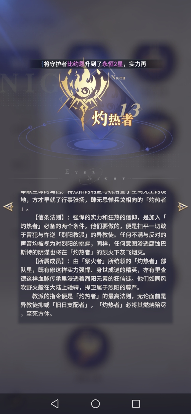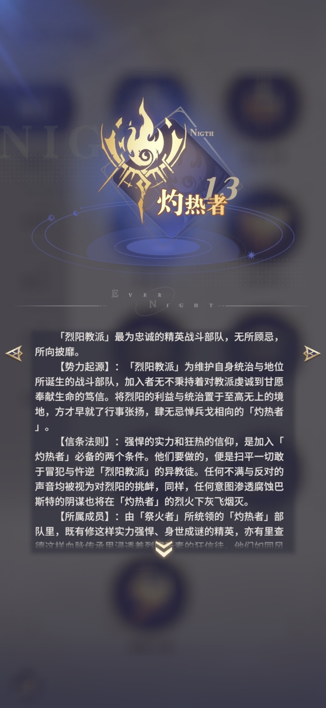 【所属成员】:由「祭火者」所统领的「灼热者」部队里,既有修这样实力强悍、身世成谜的精英,亦有里查德这样血脉传承里浸透着烈阳元素的狂信徒。他们如同风吹野火般在大陆上驰骋,捍卫属于烈阳的尊严。