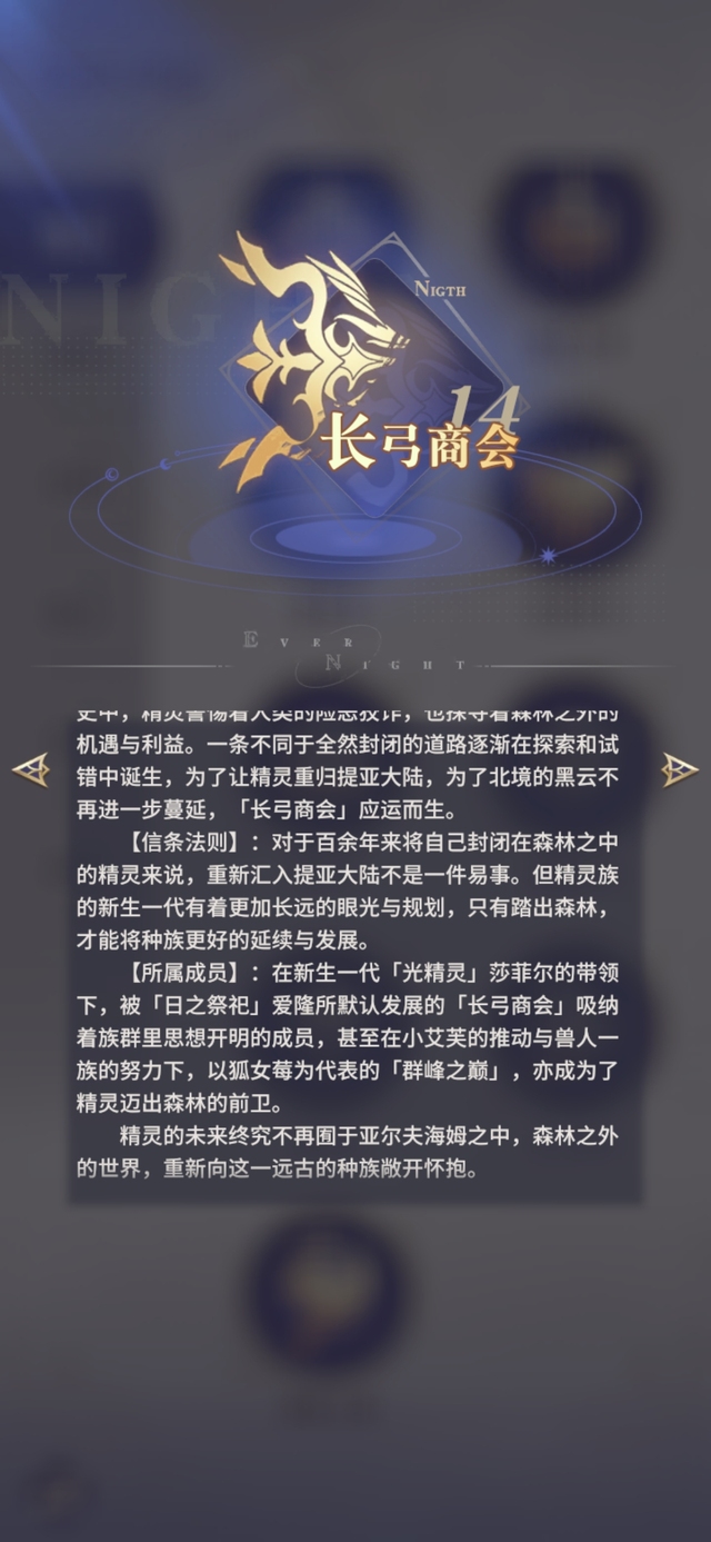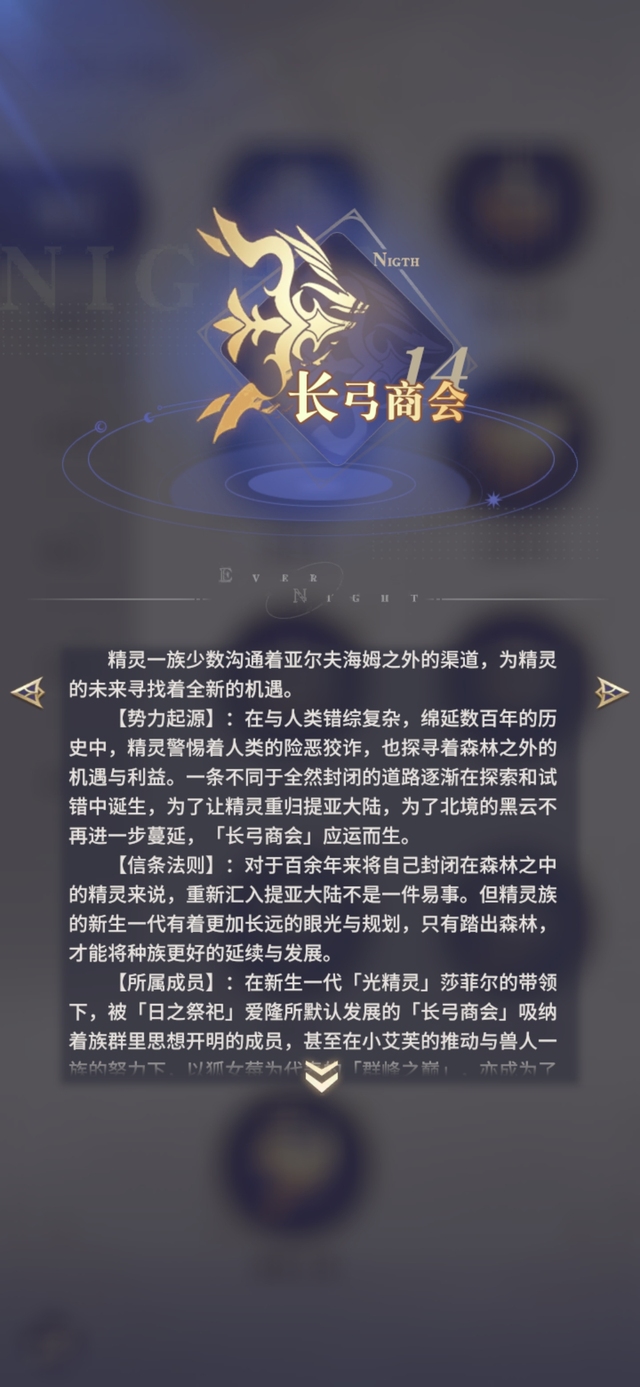 【势力起源】:在与人类错综复杂,绵延数百年的历史中,精灵警惕着人类的险恶狡诈,也探寻着森林之外的机遇与利益。一条不同于全然封闭的道路逐渐在探索和试错中诞生,为了让精灵重归提亚大陆,为了北境的黑云不再进一步蔓延,「长弓商会」应运而生。
