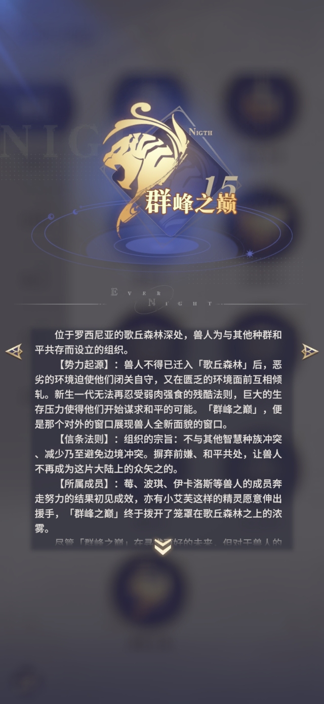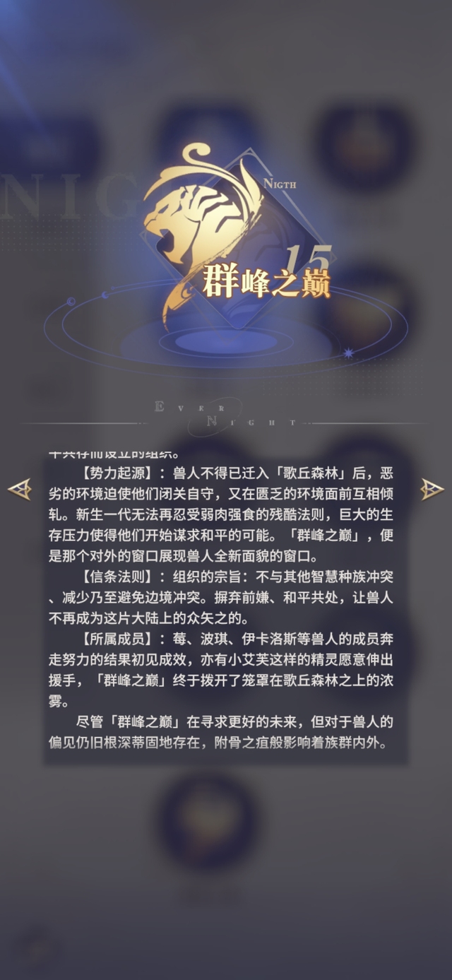 【势力起源】:兽人不得已迁入「歌丘森林」后,恶劣的环境迫使他们闭关自守,又在匮乏的环境面前互相倾轧。新生一代无法再忍受弱肉强食的残酷法则,巨大的生存压力使得他们开始谋求和平的可能。「群峰之巅」,便是那个对外的窗口展现兽人全新面貌的窗口。