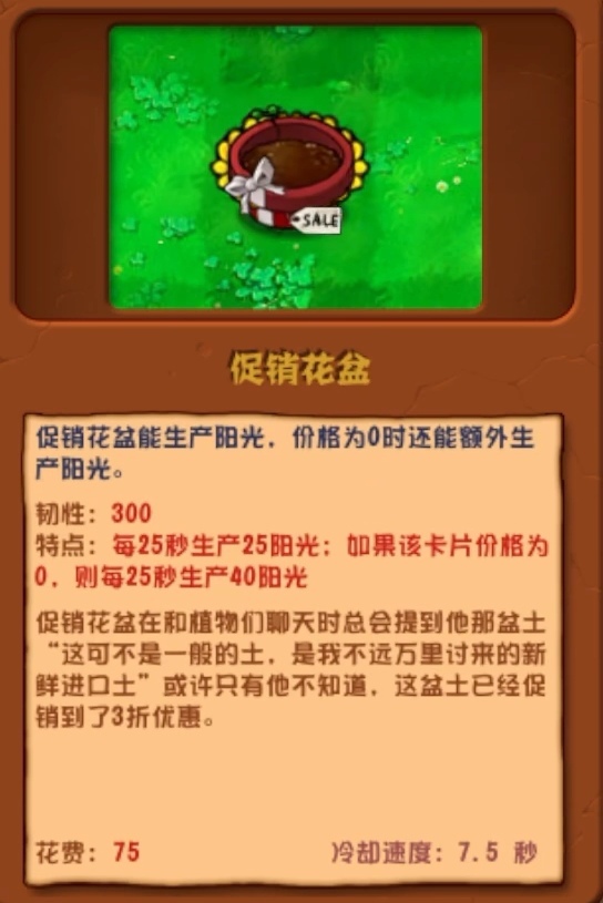 促销花盆能生产阳光,价格为0时还能额外生产阳光。