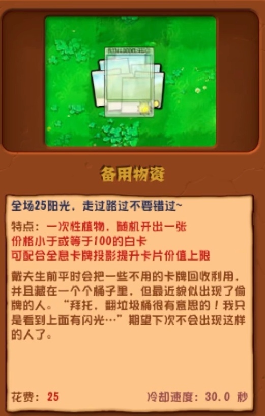 特点:每25秒生产25阳光:加果该卡片价格为0.则每25秒生产40阳光