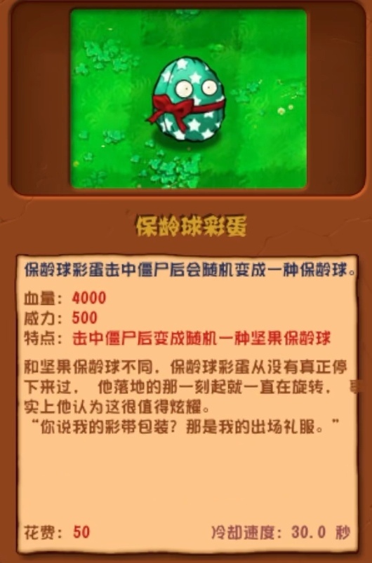 保龄球彩蛋击中僵尸后会随机变成一种保龄球血量:4000
