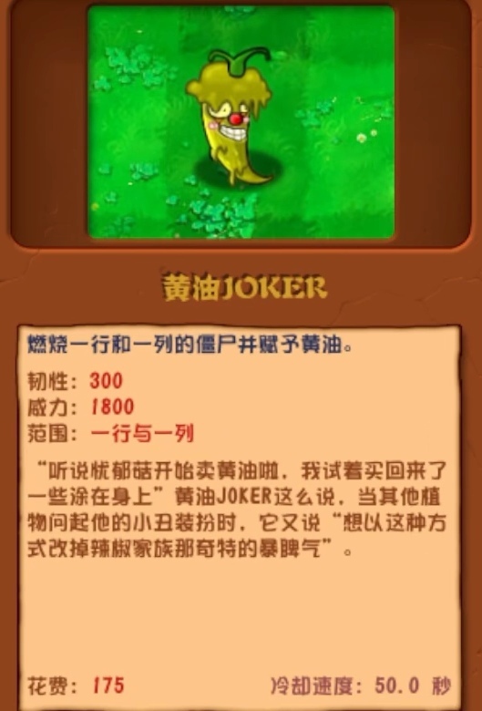 "听说忧郁菇开始卖黄油啦,我试着买回来了一些涂在身上"黄油JOKER这么说,当其他植物问起他的小丑装扮时,它又说"想以这种方式改掉辣椒家族那奇特的暴脾气"。