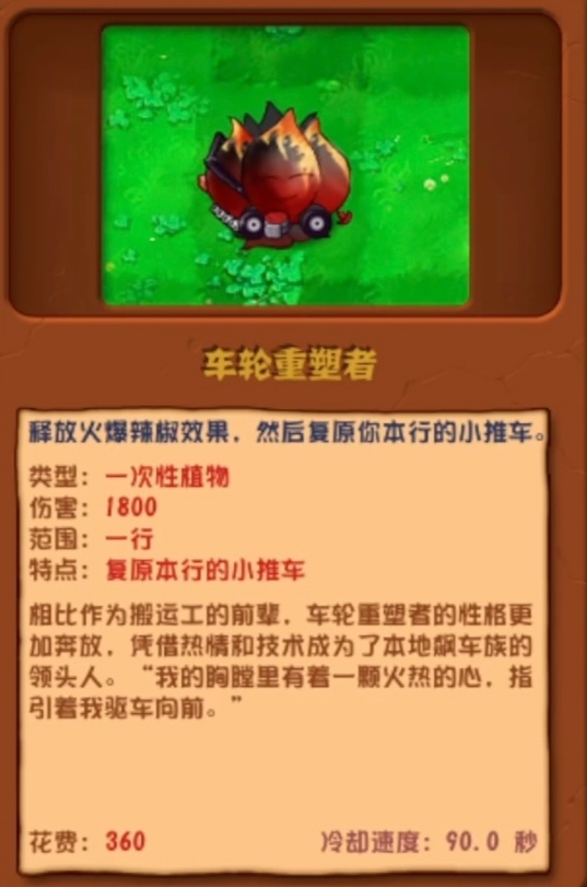 特点:种在一个格子上,消灭该格内的所有植物,然后对本行内所有僵尸造成等于该格内植物生命值总和的伤害。