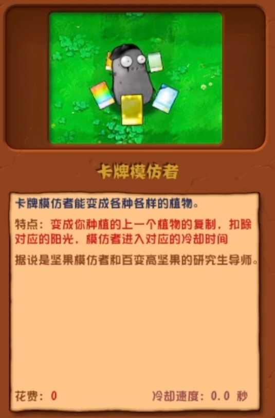 特点:变成你种植的上一个植物的复制,扣除对应的阳光,模仿者进入对应的冷却时间。