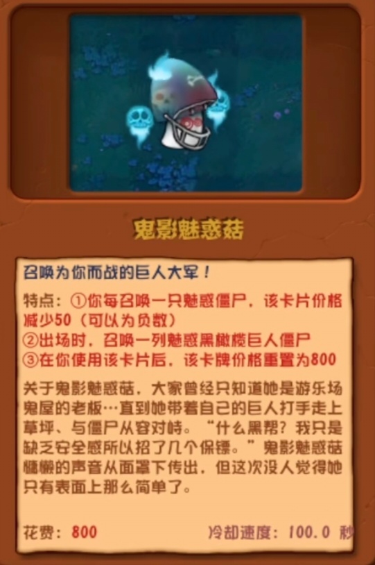 特点:①你每召一只魅惑僵尸,该卡片价格减少50(可以为负数)