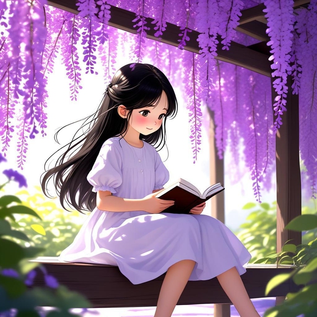 紫藤花架下,一个穿白色连衣裙的小女孩安静地坐着,阳光透过花叶间隙在她身上投下斑驳的光影