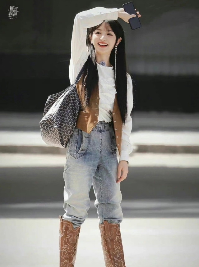 女孩今天换了一身套装,白色衬衫和一件并没有什么御寒能力的小马甲一条贴身牛仔裤被塞到了那双棕色靴子里面,显得她是刚刚从草原里面回来的一名牧者。