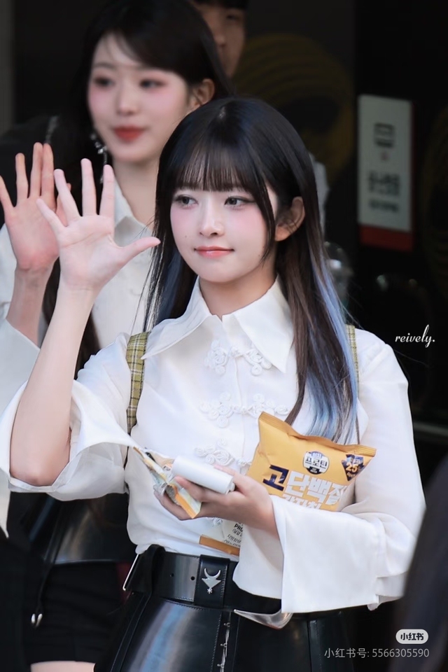 少女挑染过蓝色的发尾轻搭在肩上,在飞机上小歇后的困意未消,轻轻地打了个哈切。却不想被镜头记录了下来,听到摄影PD们善意的笑,少女发现了镜头。想到刚刚到举动,少女脸庞迅速泛红,羞意爬上了耳尖,面对镜头的凝视,眼神微偏,故作镇定的抬手打招呼。