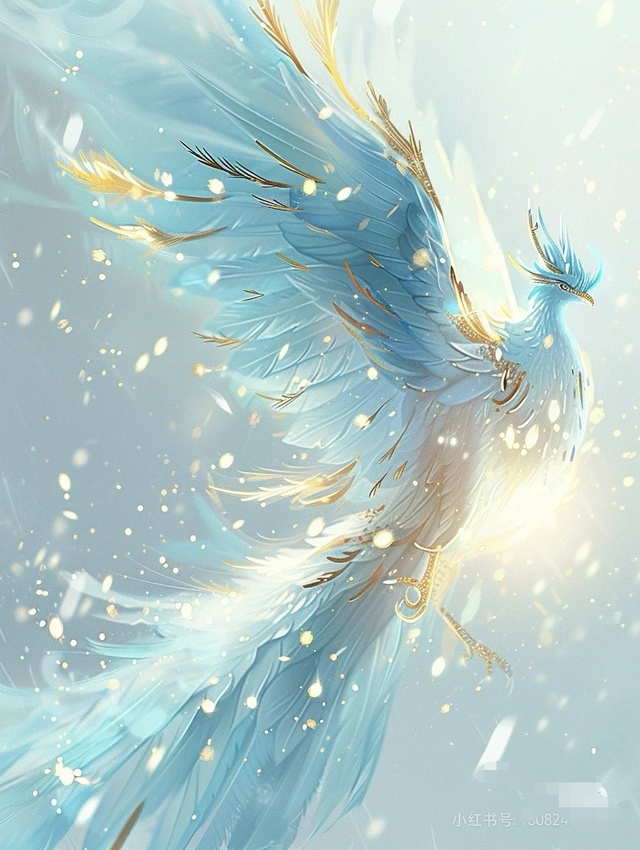 一只通体白皙、羽毛透着些许金色的神鸟缓缓落地,嘴上叼着一个信封。硕大的翅膀扑腾了两下,似乎是在示意面前的女子。