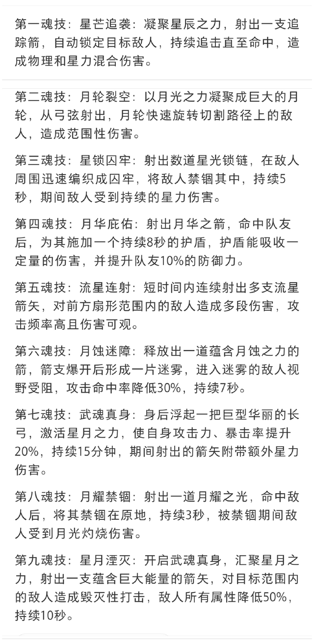凌霜月第二魂技:月轮裂空:以月光乙刀凝聚成巨大的月轮,从弓弦射出,月轮快速旋转切割路径上的敌人,造成范围性伤害。第三魂技:星锁囚牢:射出数道星光锁链,在敌人周围迅速编织成囚牢,将敌人禁锢其中,持续5秒,期间敌人受到持续的星力伤害。第四魂技:月华庇佑:射出月华之箭,命中队友后,为其施加一个持续8秒的护盾,护盾能吸收一定量的伤害,并提升队友10%的防御力。第五魂技:流星连射:短时间内连续射出多支流星箭矢,对前方扇形范围内的敌人造成多段伤害,攻击频率高且伤害可观。第六魂技:月蚀迷障:释放出一道蕴含月蚀之力的箭,箭支爆开后形成一片迷雾,进入迷雾的敌人视野受阻,攻击命中率降低30%,持续7秒。第七魂技:武魂真身:身后浮起一把巨型华丽的长弓,激活星月之力,使自身攻击力、暴击率提升20%,持续15分钟,期间射出的箭矢附带额外星力伤害。第八魂技:月耀禁锢:射出一道月耀之光,命中敌人后,将其禁锢在原地,持续3秒,被禁锢期间敌人受到月光灼烧伤害。第九魂技:星月湮灭:开启武魂真身,汇聚星月之力,射出一支蕴含巨大能量的箭矢,对目标范围内的敌人造成毁灭性打击,敌人所有属性降低50%,持续10秒。