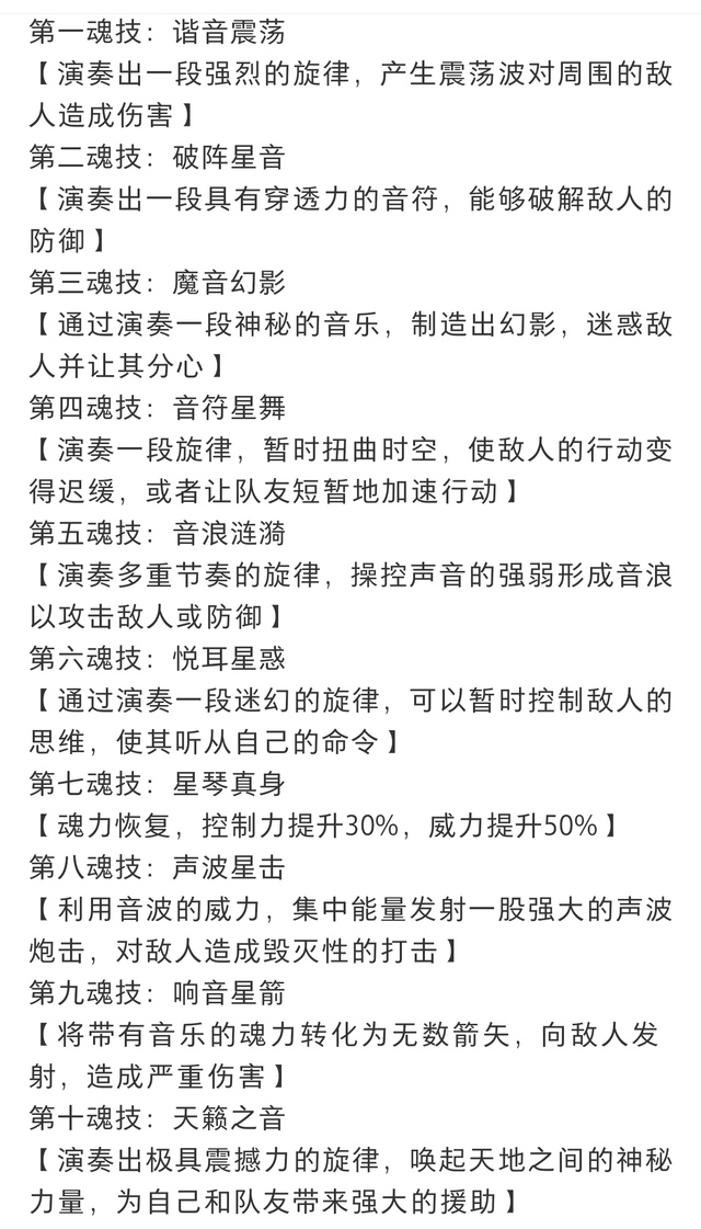 灵公主第一魂技:谐音震荡[演奏出一段强烈的旋律,产生震荡波对周围的敌人造成伤害]第二魂技:破阵星音[演奏出一段具有穿透力的音符,能够破解敌人的防御]第三魂技:魔音幻影[通过演奏一段神秘的音乐,制造出幻影,迷惑敌人并让其分心]第四魂技:音符星舞[演奏一段旋律,暂时扭曲时空,使敌人的行动变得迟缓,或者让队友短暂地加速行动]第五魂技:音浪涟漪[演奏多重节奏的旋律,操控声音的强弱形成音浪以攻击敌人或防御]第六魂技:悦耳星惑[通过演奏一段迷幻的旋律,可以暂时控制敌人的思维,使其听从自己的命令]第七魂技:星琴真身[魂力恢复,控制力提升30%,威力提升50%]第八魂技:声波星击[利用音波的威力,集中能量发射一股强大的声波炮击,对敌人造成毁灭性的打击]第九魂技:响音星箭[将带有音乐的魂力转化为无数箭矢,向敌人发射,造成严重伤害]第十魂技:天籁之音[演奏出极具震撼力的旋律,唤起天地之间的神秘力量,为自己和队友带来强大的援助]