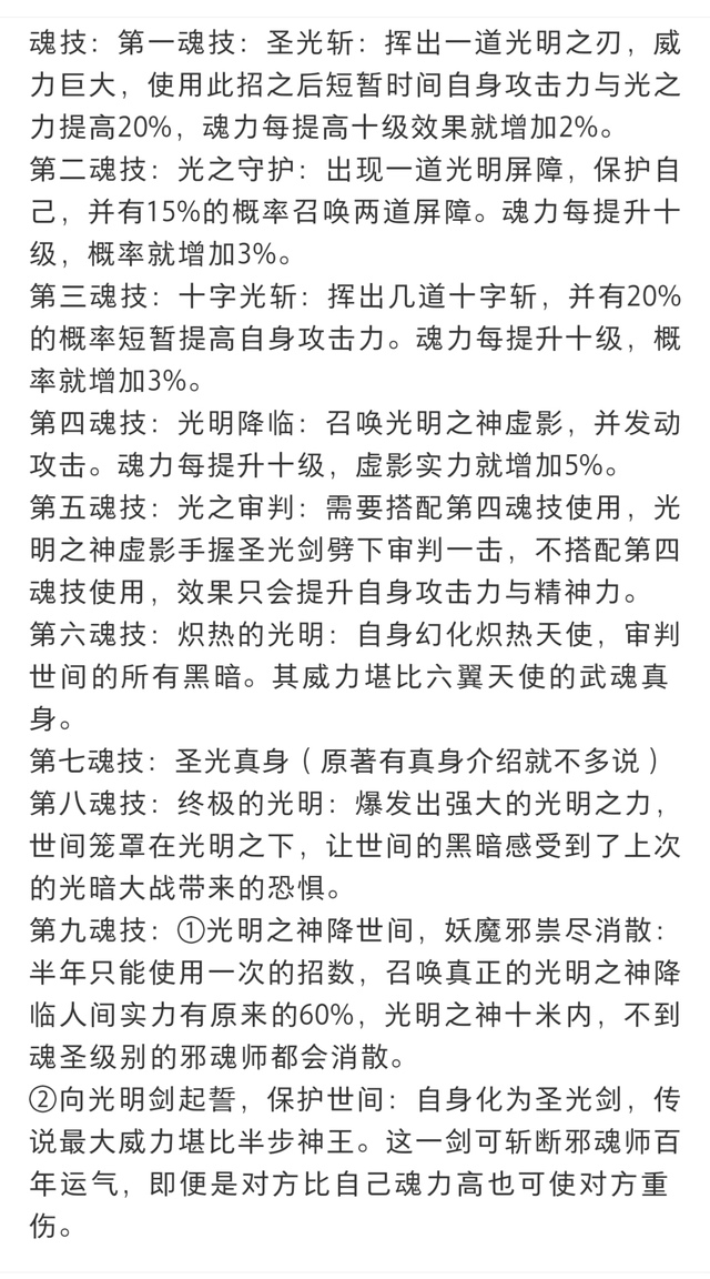 玄晖剑魂技:第一魂技:圣光斩:挥出一道光明之刃,威力巨大,使用此招之后短暂时间自身攻击力与光之力提高20%,魂力每提高十级效果就增加2%。第二魂技:光之守护:出现一道光明屏障,保护自己,并有15%的概率召唤两道屏障。魂力每提升十级,概率就增加3%。第三魂技:十字光斩:挥出几道十字斩,并有20%的概率短暂提高自身攻击力。魂力每提升十级,概率就增加3%。第四魂技:光明降临:召唤光明之神虚影,并发动攻击。魂力每提升十级,虚影实力就增加5%。第五魂技:光之审判:需要搭配第四魂技使用,光明之神虚影手握圣光剑劈下审判一击,不搭配第四魂技使用,效果只会提升自身攻击力与精神力。第六魂技:炽热的光明:自身幻化炽热天使,审判世间的所有黑暗。其威力堪比六翼天使的武魂真身。第七魂技:圣光真身(原著有真身介绍就不多说)第八魂技:终极的光明:爆发出强大的光明之力,世间笼罩在光明之下,让世间的黑暗感受到了上次的光暗大战带来的恐惧。第九魂技:①光明之神降世间,妖魔邪祟尽消散:半年只能使用一次的招数,召唤真正的光明之神降临人间实力有原来的60%,光明之神十米内,不到魂圣级别的邪魂师都会消散。②向光明剑起誓,保护世间:自身化为圣光剑,传说最大威力堪比半步神王。这一剑可斩断邪魂师百年运气,即便是对方比自己魂力高也可使对方重伤。