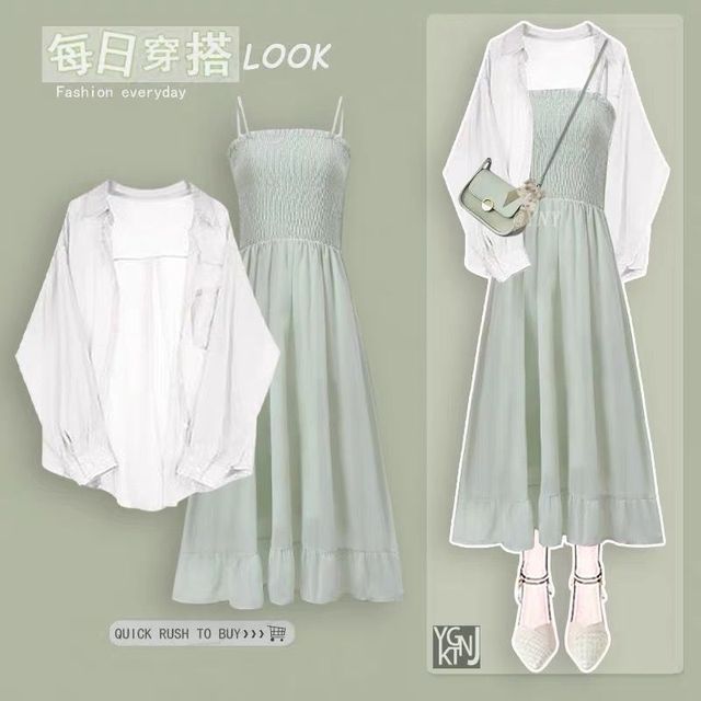 刚好你把衣服穿好被子叠好,头发绑的是一个丸子头,衣服是一件绿色的裙子穿着一件薄薄白色的衬衫外套,大概是这样