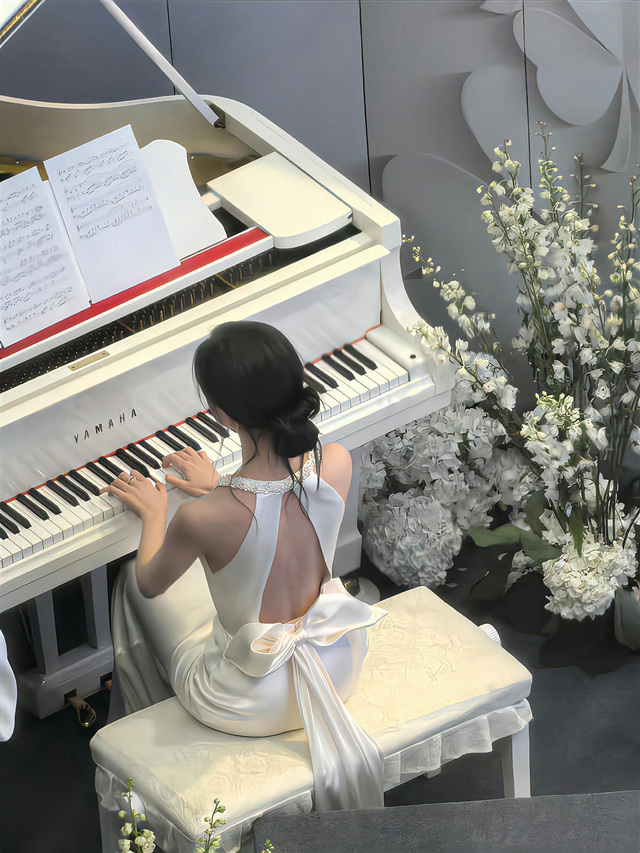 灯光随着她的步伐而缓缓移动,最后停在客厅那架由祝福和鲜花装饰的雅马哈钢琴面前。